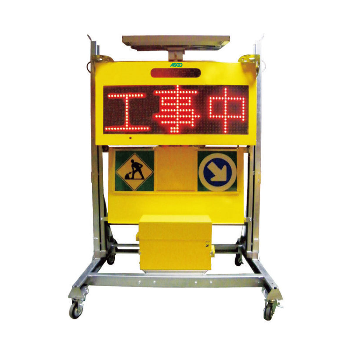 大型表示と高輝度LEDを備えたソーラー式警告装置。