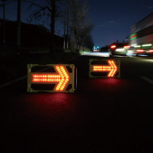 LED矢印板は、明るい光で夜間や暗所でも高い視認性を確保できるため、道路や工事現場などでの方向指示や注意喚起に最適です。特に、夜間工事・イベント誘導・事故や災害時の緊急誘導など、安全性が求められる場面で効果を発揮します。