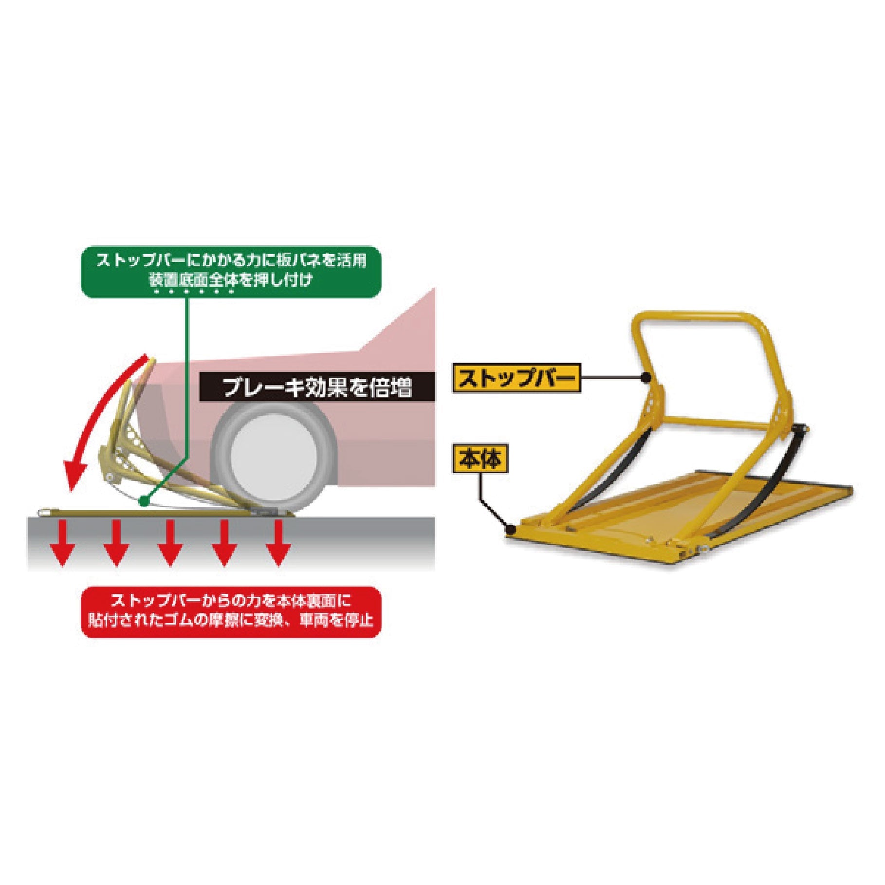 ●車両がストップバーを下方向に押し付けることで、ストップバーに付属する板バネを介して本体底面全体が路面に押しつけられ、本体裏面に貼付されているゴムの摩擦エネルギーによって車両を停止させます。