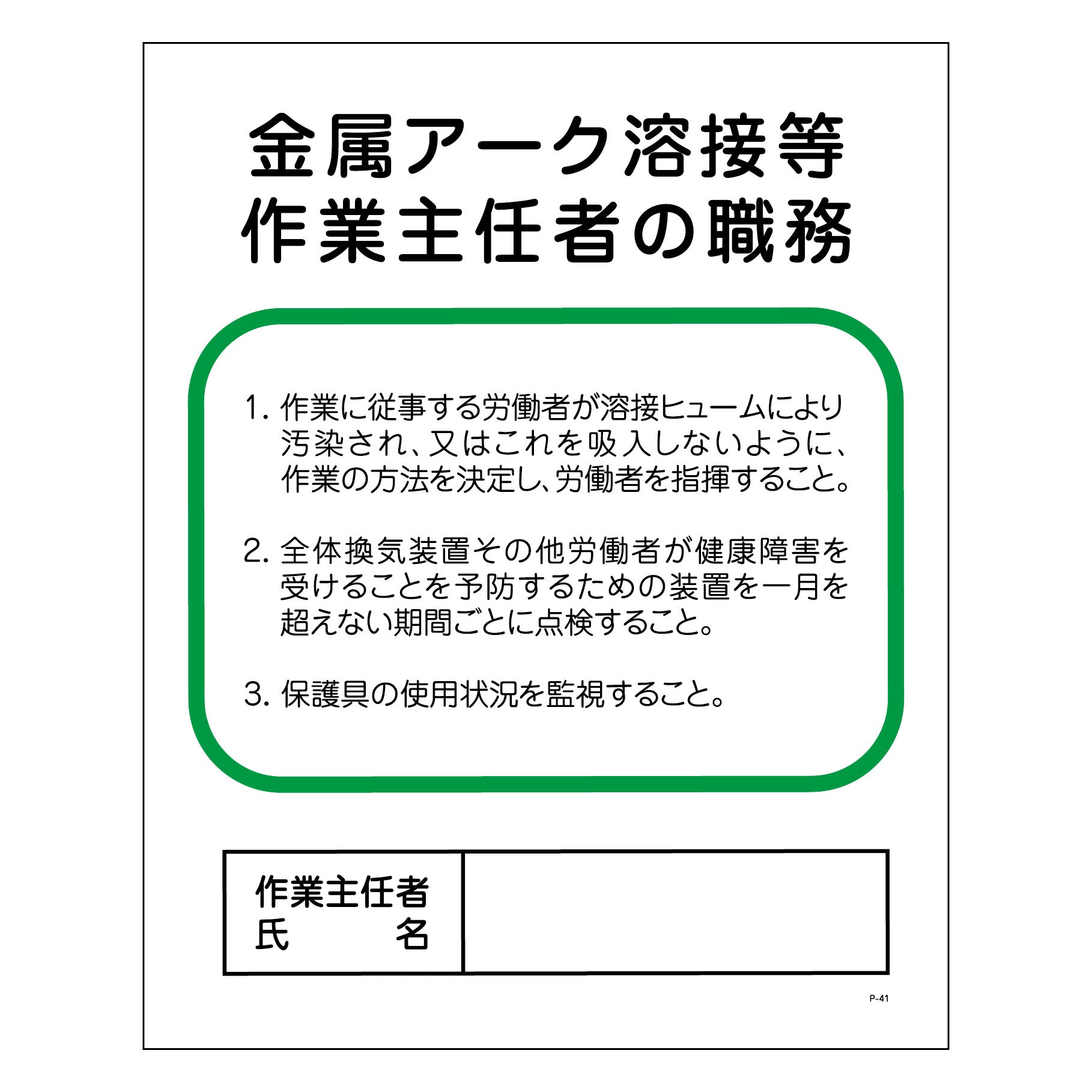 金属アーク溶接等作業主任者の職務として掲示する標識になります。