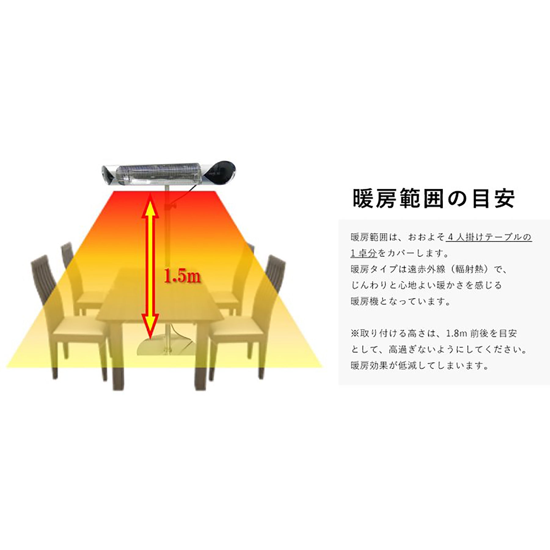 ●レストランカフェ、ホテル、結婚式場などの屋外テラス席の暖房、商業施設などの局所暖房としてもご活用いただけます。