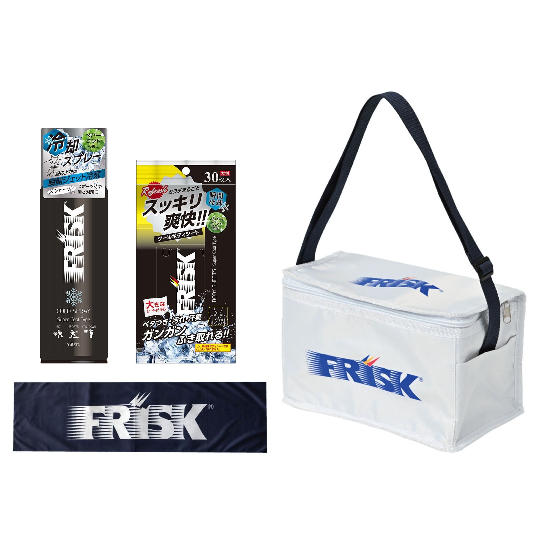 ●ケース入りの冷感タオル(ネイビー)、メントール配合のボディシート、冷却スプレーをオリジナルの保冷バッグに詰めたFRISKキットです。