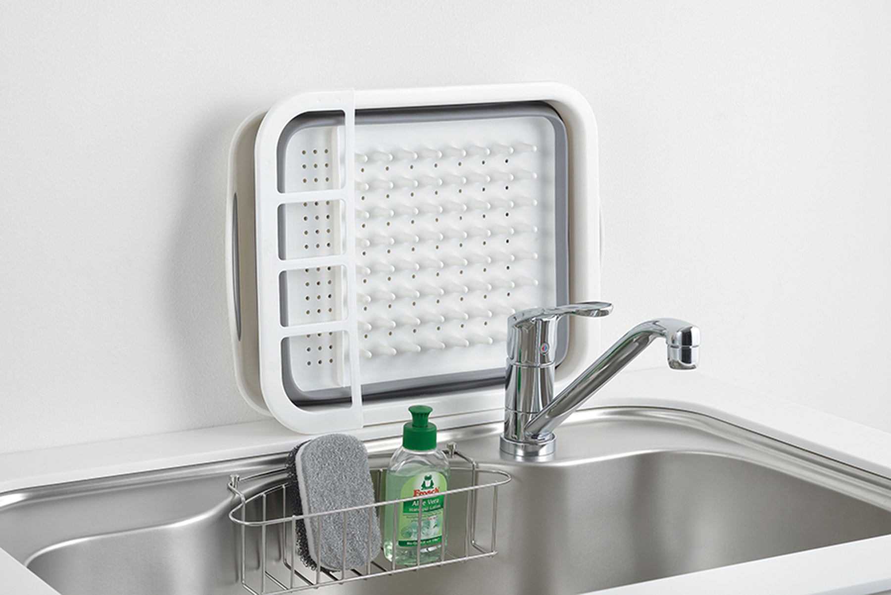 デイズ 折畳み水切りバスケットは、コンパクトに収納できる折り畳み式の水切りカゴと、配膳用としてもお使いいただけるトレーのセットです。