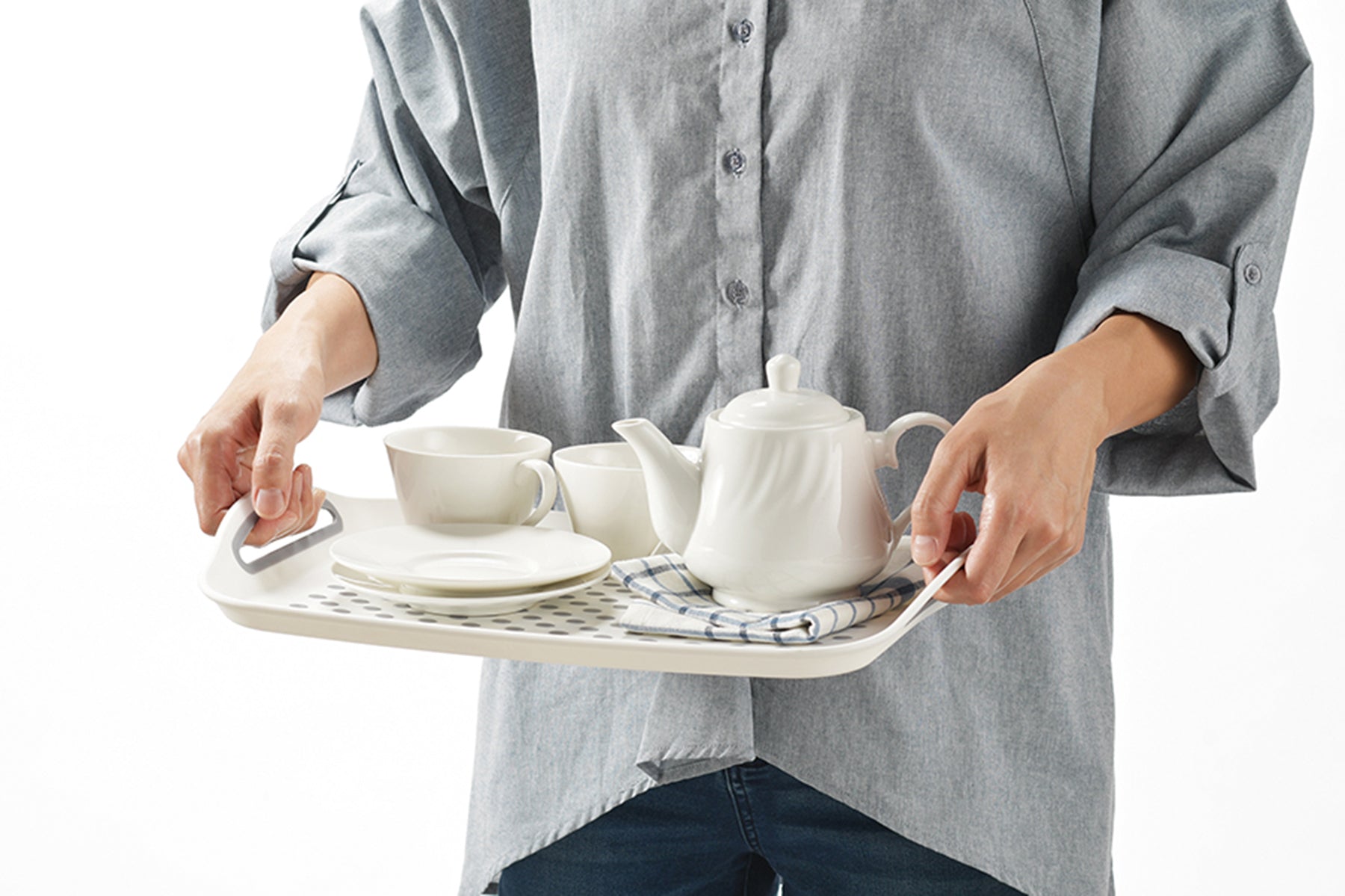 トレーは滑り止め付で、配膳用のお盆としても使用可能です。
