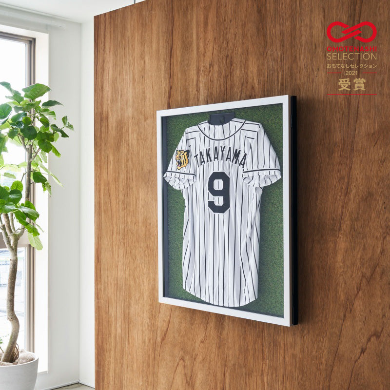 前開き式の扉を開けて、専用ハンガーにユニフォームをセットするだけで簡単に額装ができます。
