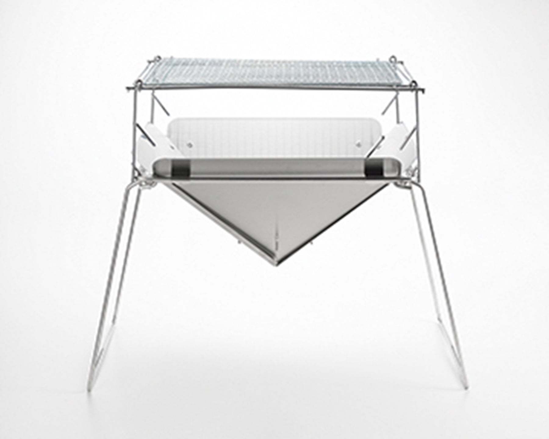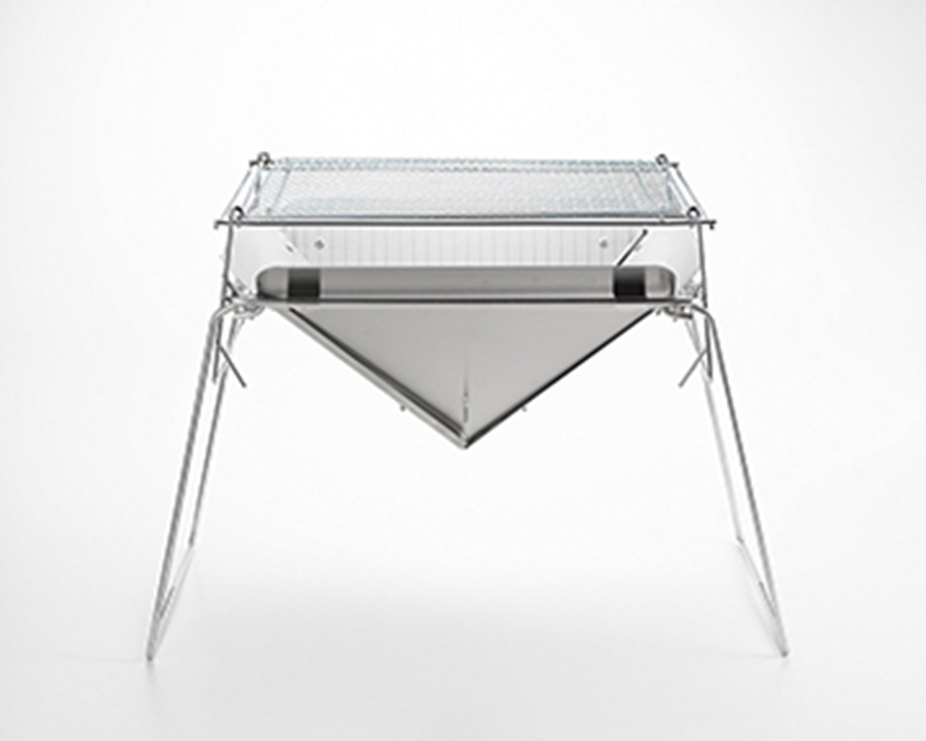 ●折りたたんだ本体(初回のみプレートを差し込み)を開いてロストルを差し込み地面に置くだけで設置できます。