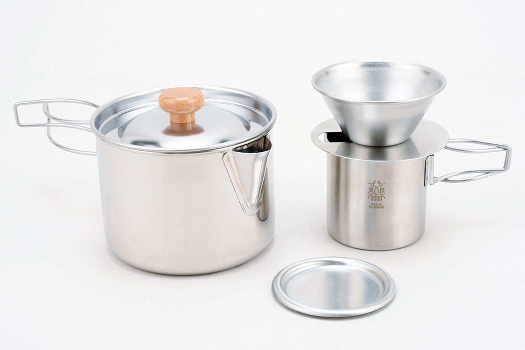 ●お鍋とケトルが一つになったケトルクッカーと、分割式ドリッパー、二重マグカップがセットになったコンパクトドリッパーセットです。