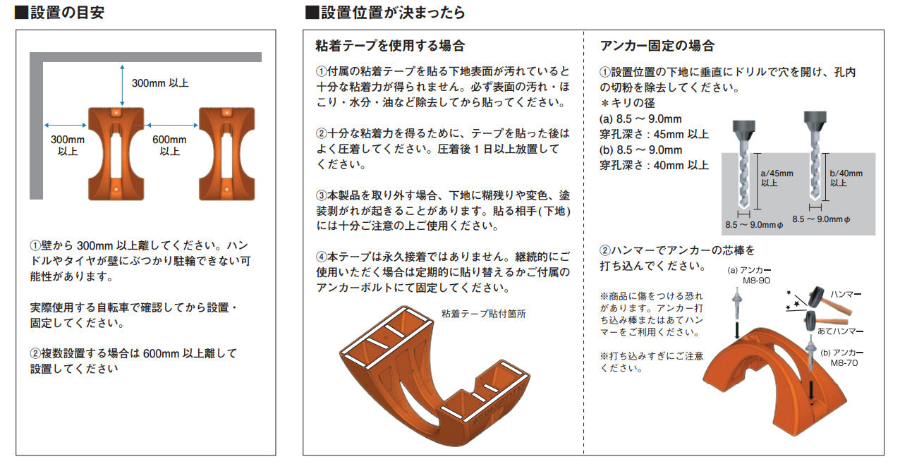| 設置には必ず両面テープ・ネジ・アンカーなどで床面に固定してください。床面に固定せずにご使用いただくことは出来ません。 |