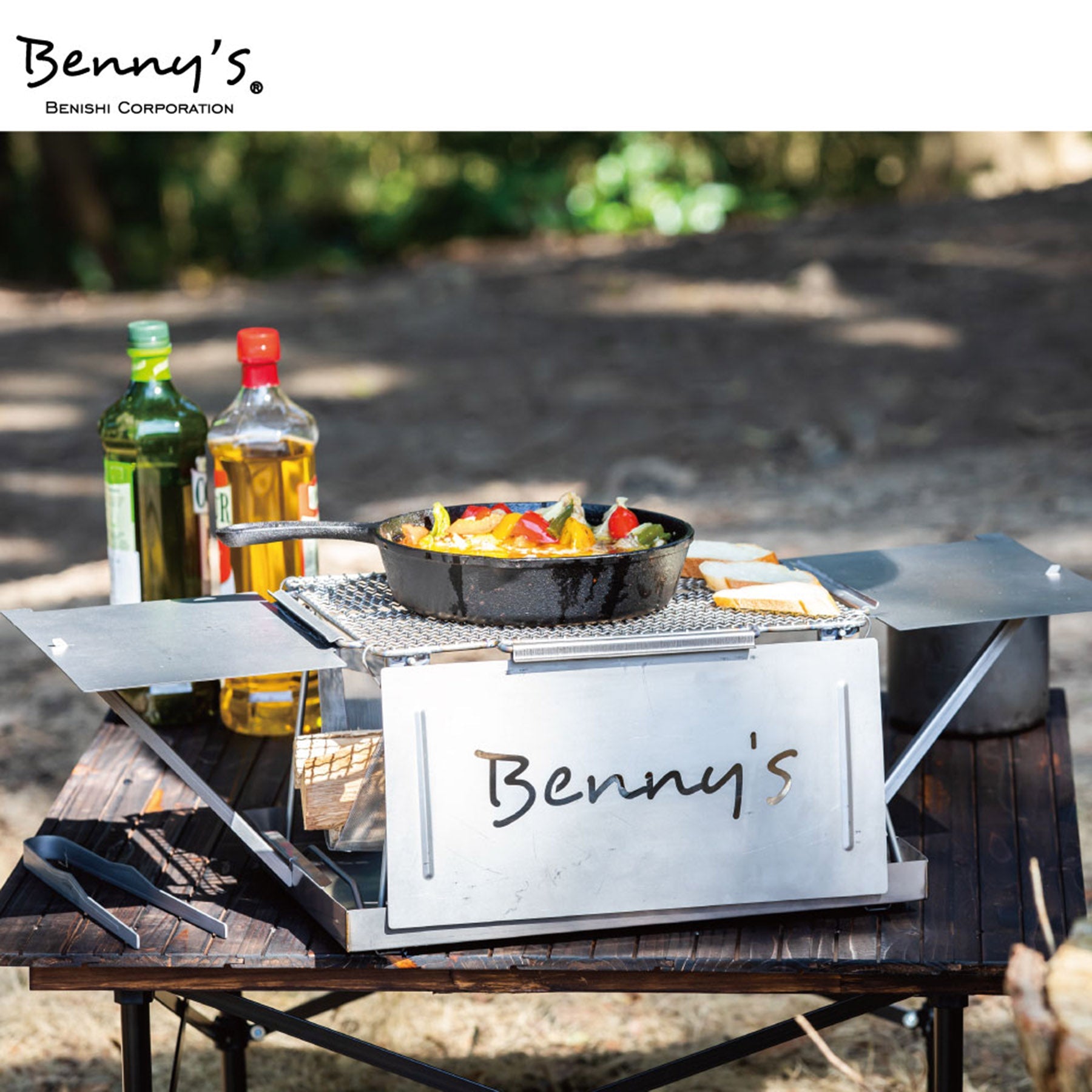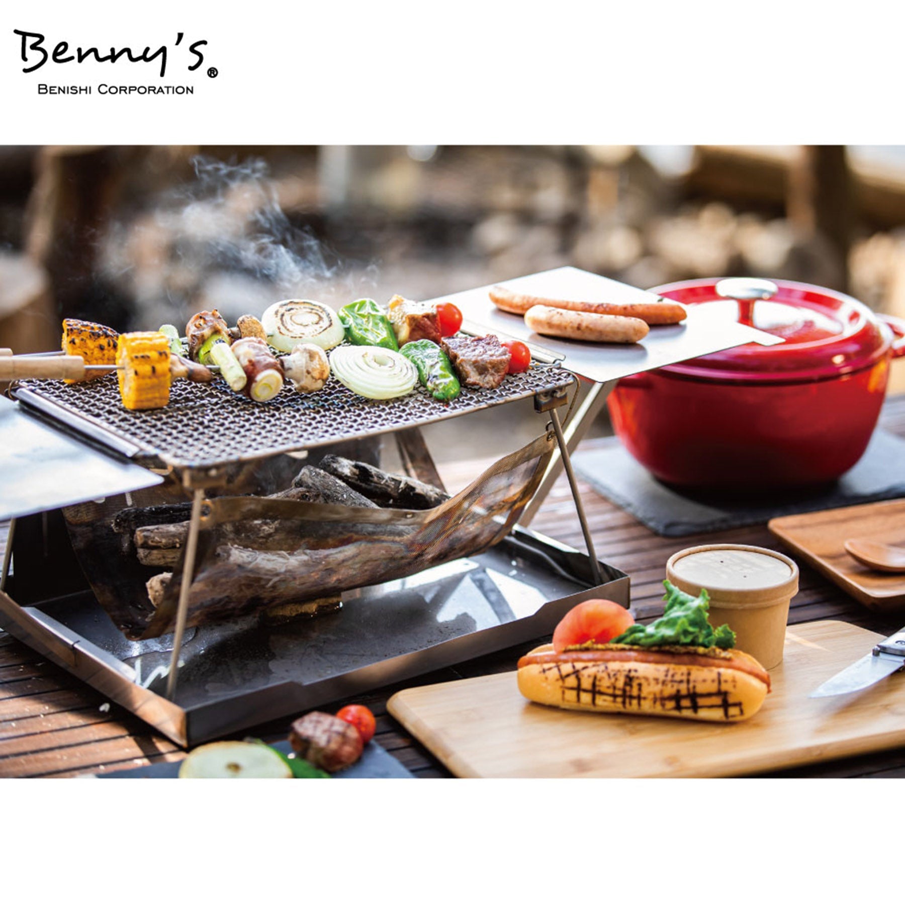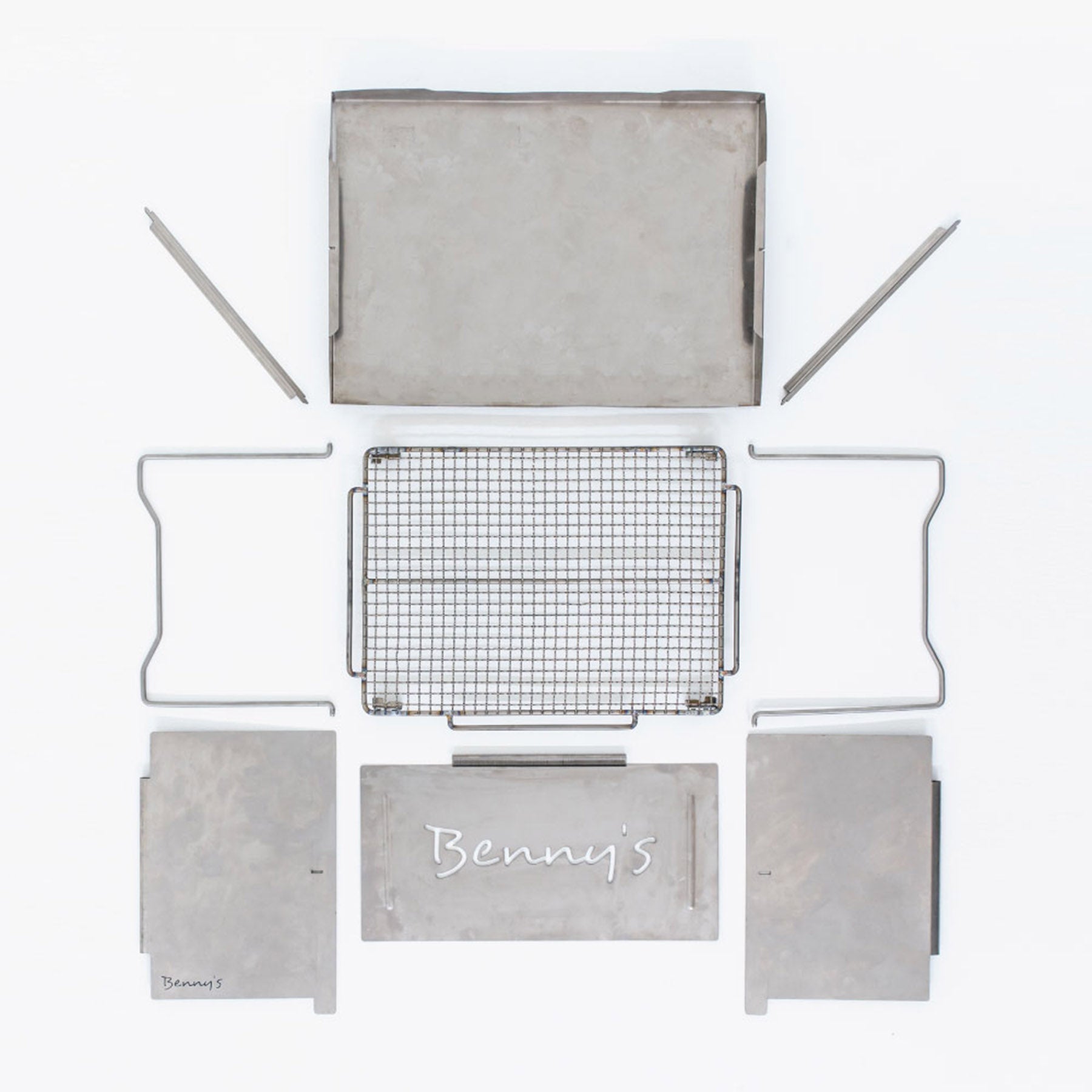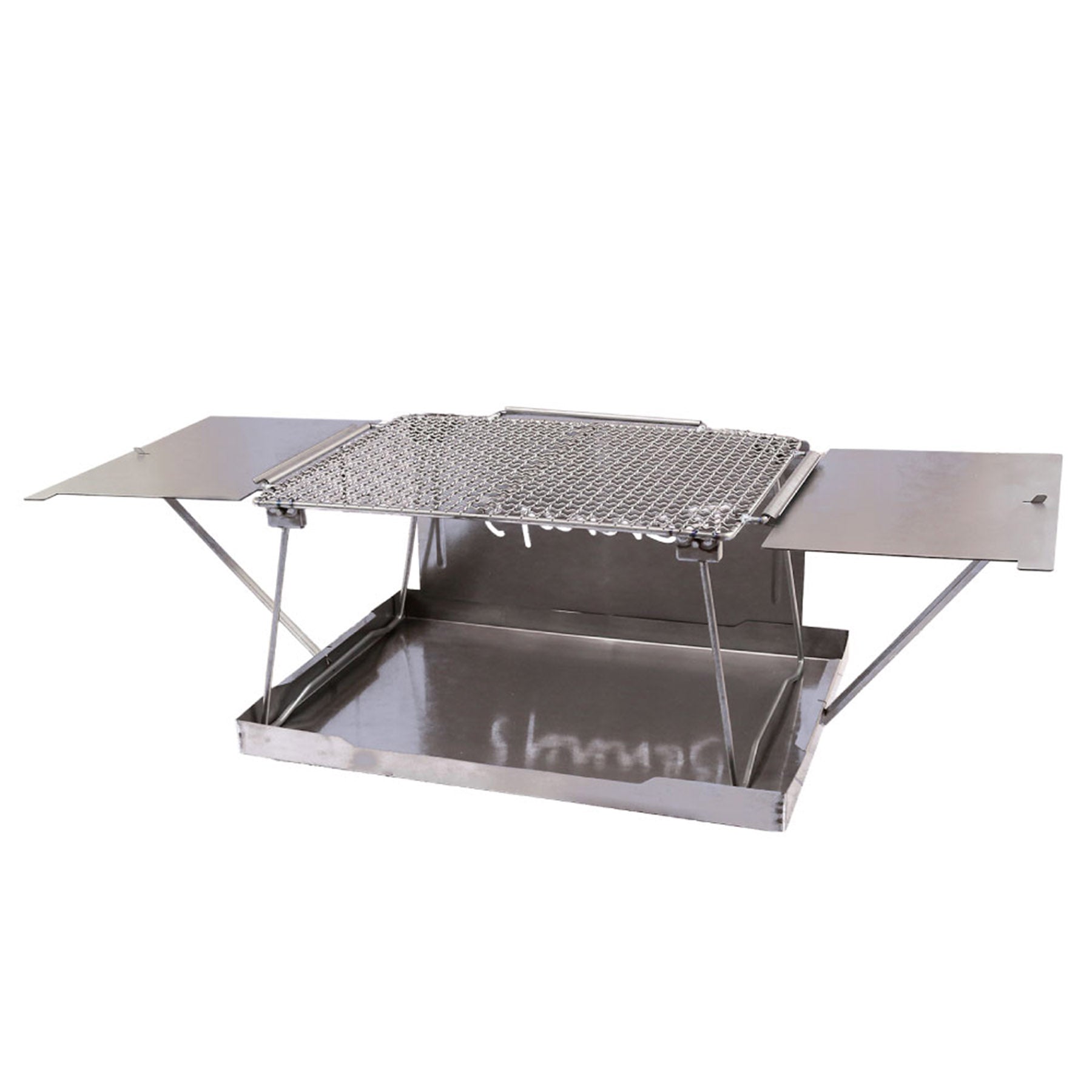 ●3方向に取り付けられたチタン製風防とスタンド、延焼防止トレー、金属製のネットを使い分けることにより、1機種ながら4種類のグリルと2種類の焚火台として使用可能です。