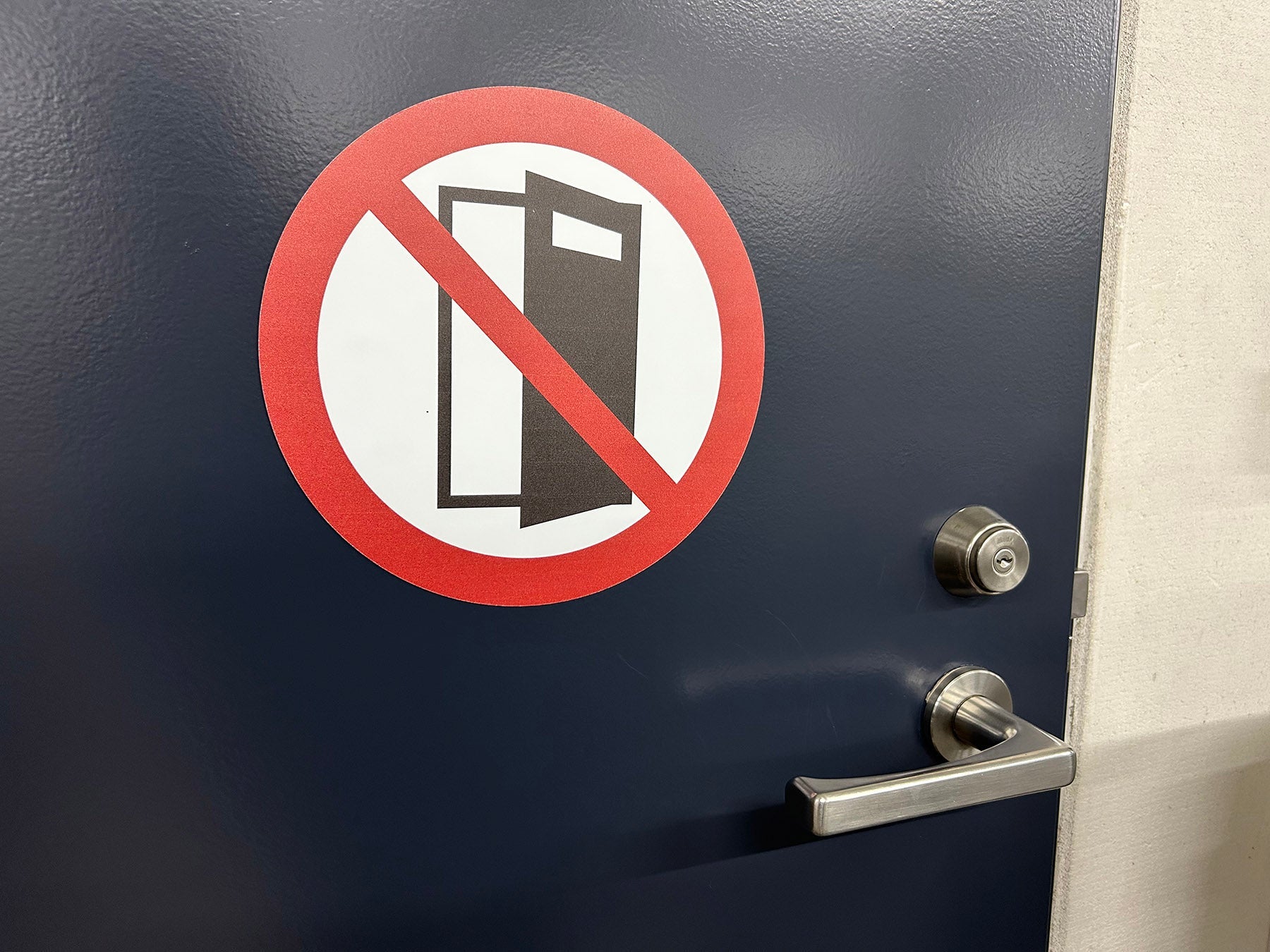 ●ドアや壁などに簡単に貼り付けることができ、わかりやすく注意を促せます。シンプルなので景観やその他標識等の邪魔になりません。
