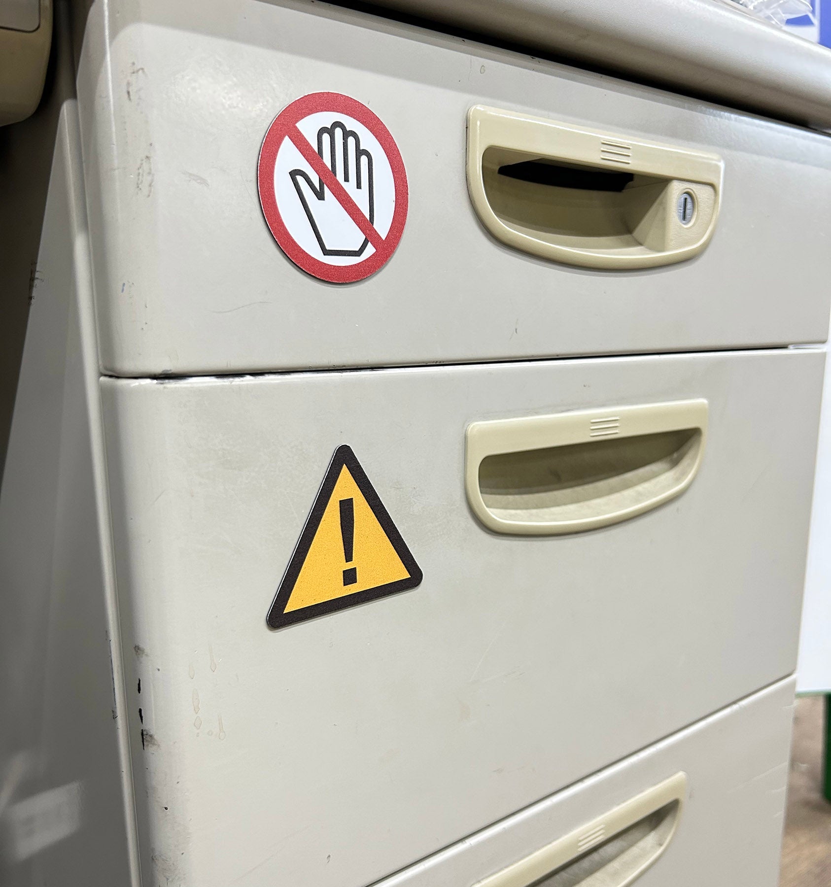 ●ドアや壁などに簡単に貼り付けることができ、わかりやすく注意を促せます。シンプルなので景観やその他標識等の邪魔になりません。