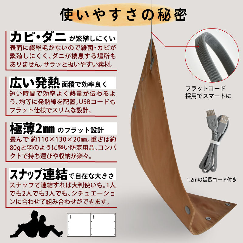 ●家計に優しい省エネ設計。1日5時間使用して、1日あたりの電気料金約1.3円。USB給電だから便利。<<出力5V1A以上の電源を使用してください>>スポーツ観戦などの、冷やっとするベンチシートなどには最適。汚れに強い素材で、アウトドアにもピッたり。電源の確保が難しい、釣り場や登山にも便利。軽量でかさばらないのが◎、ベビーカーやバイク等のシートウォーマーとして。抱き枕やクッションに入れて、冷え性の方の睡眠のお手伝い。かさばらず、ごわつかないので、いつも身の回りのあるものがすぐに暖房器具に。