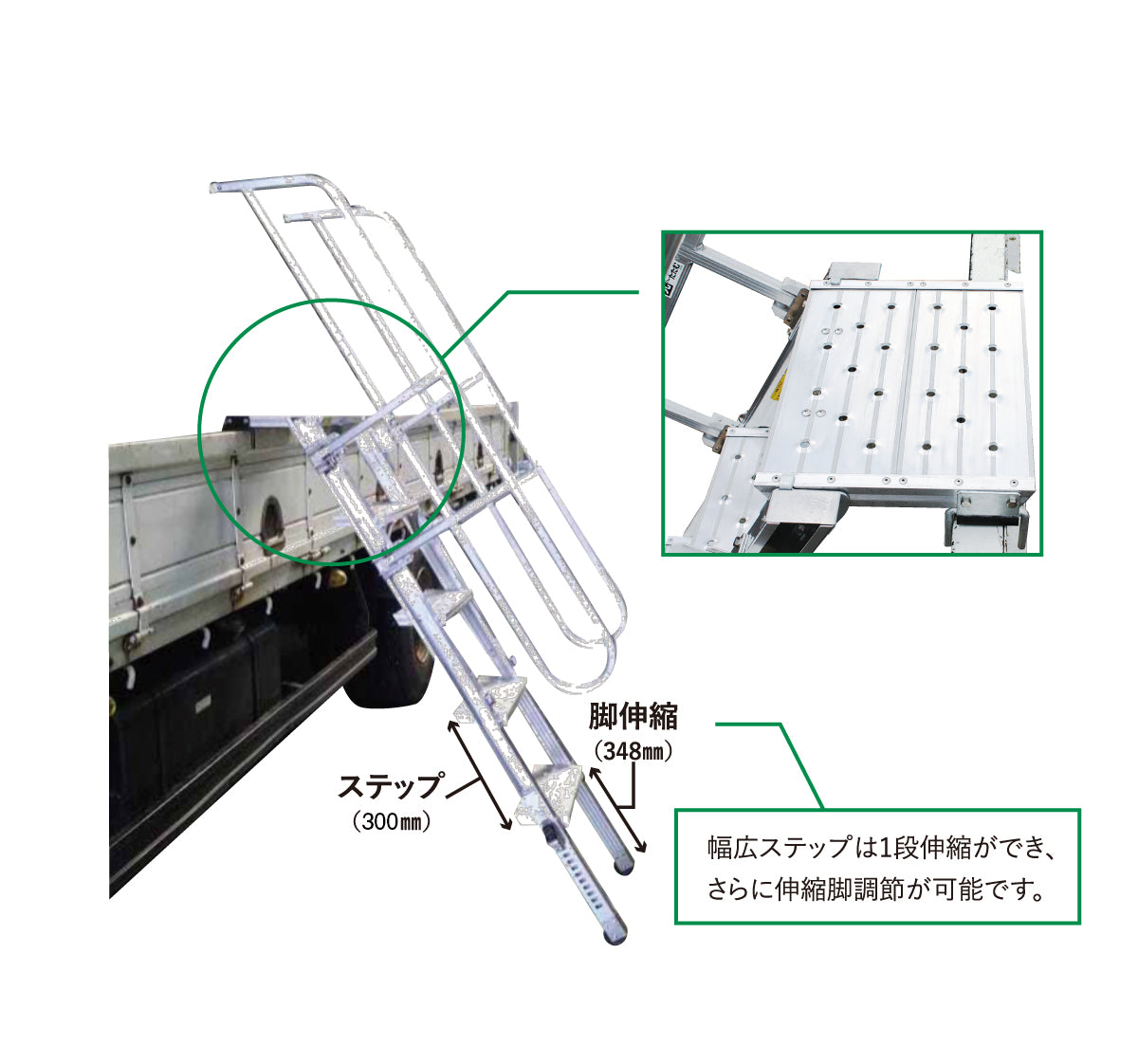 NETIS登録番号:CG-210011-A 垂直床高(mm):1391~1847 収納寸法(mm):幅703x長さ2216x高さ187 設置時出幅(mm):1050~1314(正面幅579) 設置全高(mm):2003~2459 天板寸法(mm):300x400 ステップ伸縮幅(mm):300 脚伸縮幅(mm):348(20ピッチ) ステップ幅(mm):150 対応荷台高さ(m):1~1.8 |