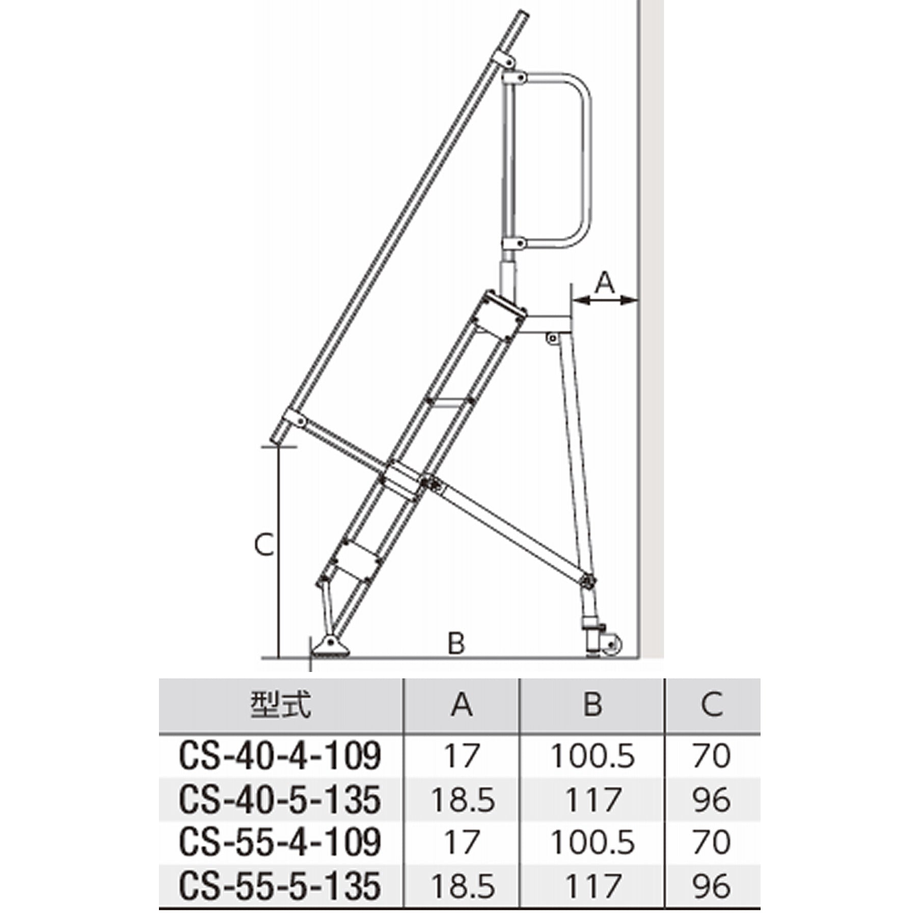 天板高さ(m):1.09・天板寸法(mm):400x320・ステップ寸法(mm):400x160・設置寸法(mm):全幅810x奥行1010・収納寸法(mm):長さ1610x幅810x厚み360・キャスター径(mm):直径75・踏ざん(mm):幅550x奥行160・最大使用質量(kg):100 |