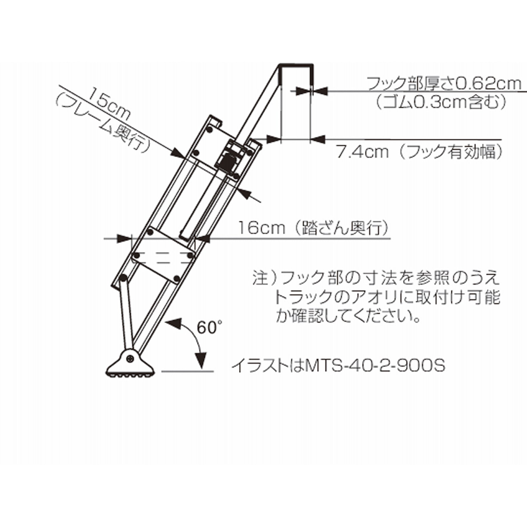 フックの高さ(mm):1670~1980・ステップ最上段高さ(mm):1610・踏ざん幅(mm):400・踏ざん奥行(mm):160・フック内径(mm):74・最大使用質量(kg):100 |