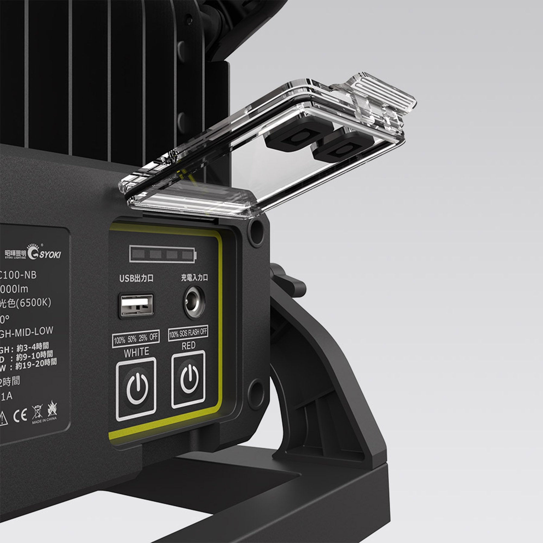 充電式投光器は、超高輝度の11000ルーメンを誇り、遠くからでも視認性の高い警告灯を搭載しています。充電バッテリーでの点灯はもちろん、ACアダプタを使用しての点灯も可能です。5V1AのUSB出力・給電機能付きで、モバイルバッテリーとしても使用できます。点灯後約5秒経過すると、スイッチを一回押すだけでどのモードからでも消灯が可能な便利な設計です。作業現場や緊急時の照明に最適です。