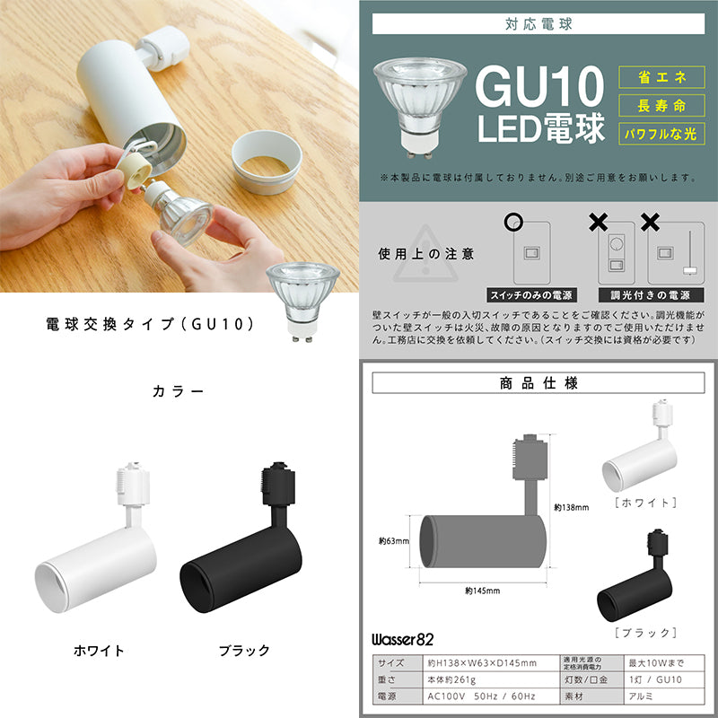 カラー:ホワイト/ブラック・サイズ(mm):約H138×W63×D145・重さ(g):本体/約261・電源:AC100V 50Hz / 60Hz・適用光源の定格消費電力:最大10Wまで・灯数/口金:1灯 / GU10 (電球別売り)・素材:ABS/鉄・保証:1年 |