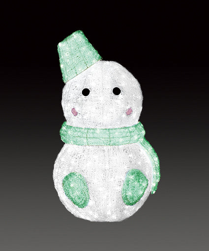 ●ゆるキャラのような可愛らしいスタイルのイルミネーションです。淡い色で着色したバケツの帽子にマフラー、手袋、スノーマンがこんなに可愛らしいイルミネーションになりました。