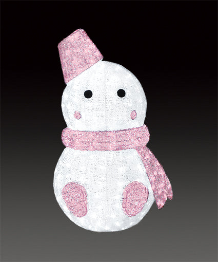 ●ゆるキャラのような可愛らしいスタイルのイルミネーションです。淡い色で着色したバケツの帽子にマフラー、手袋、スノーマンがこんなに可愛らしいイルミネーションになりました。