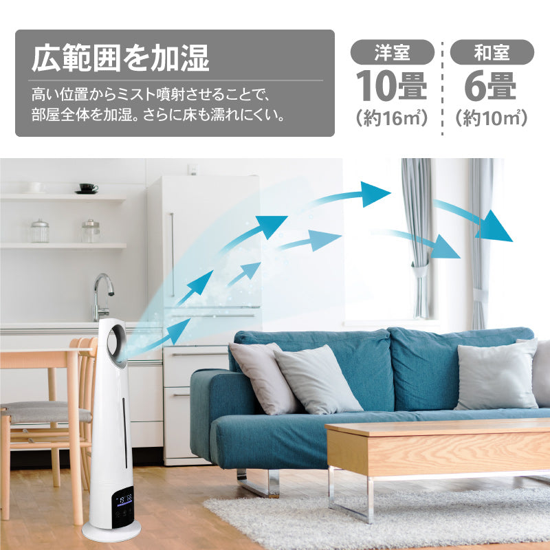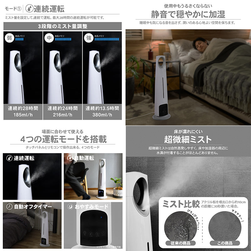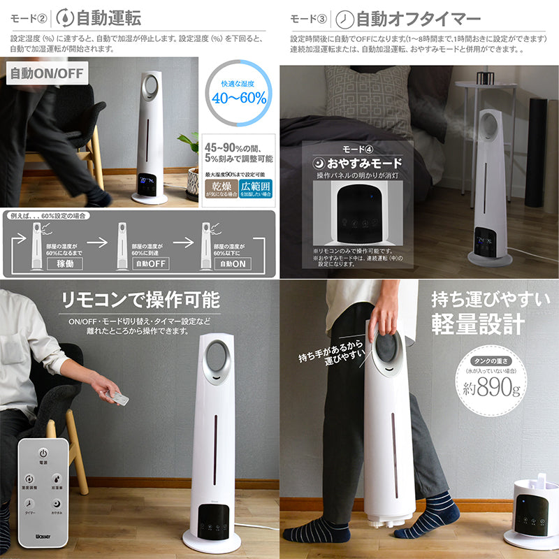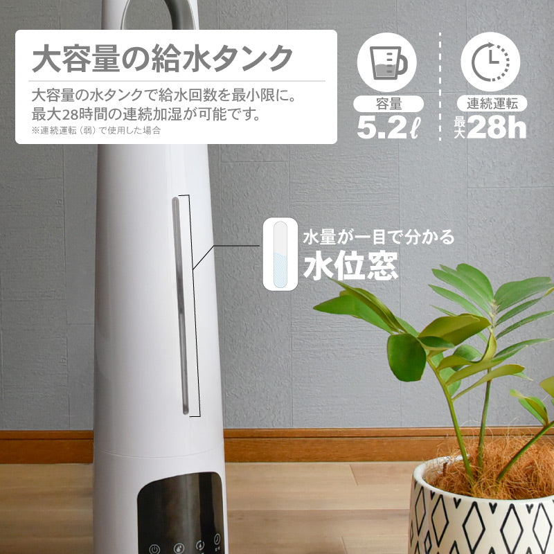 超音波加湿器 大容量タワー型 静音軽量 手入れ簡単 リモコン付き 空焚き防止