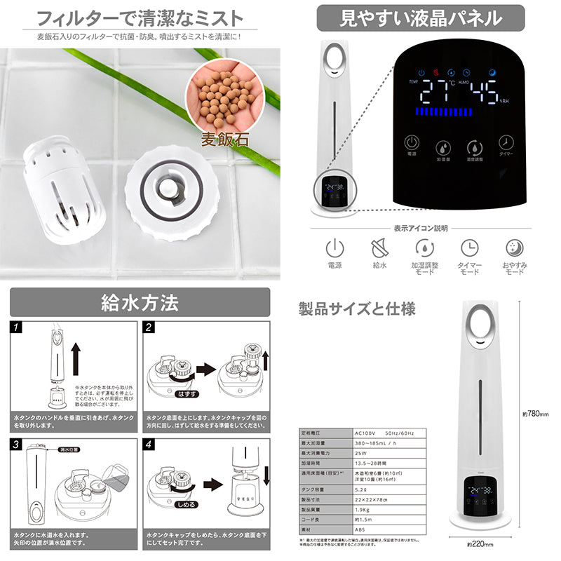 ●省エネ、大容量の超音波加湿器。1日8時間、"強"の設定で連続運転しても、電気料金は約5.4円。 実用性とデザイン性を兼ね備えている一台。 5.2Lの大容量で弱運転最長28時間、強運転で最大8時間運転可能。 内蔵センサーでお好みの湿度をキープし、自動に加湿するので、さらに長時間の運転も可能。 大型液晶パネルで一目周囲の状況や加湿器の設定を確認できます。 おやすみモードでパネルが自動消灯。空焚き防止の自動OFF機能搭載。 メイン部分とタンクが分かれていて、お手入れ簡単。 麦飯石入りの浄水カートリッジ付き。 リモコン付き、遠隔操作が可能。