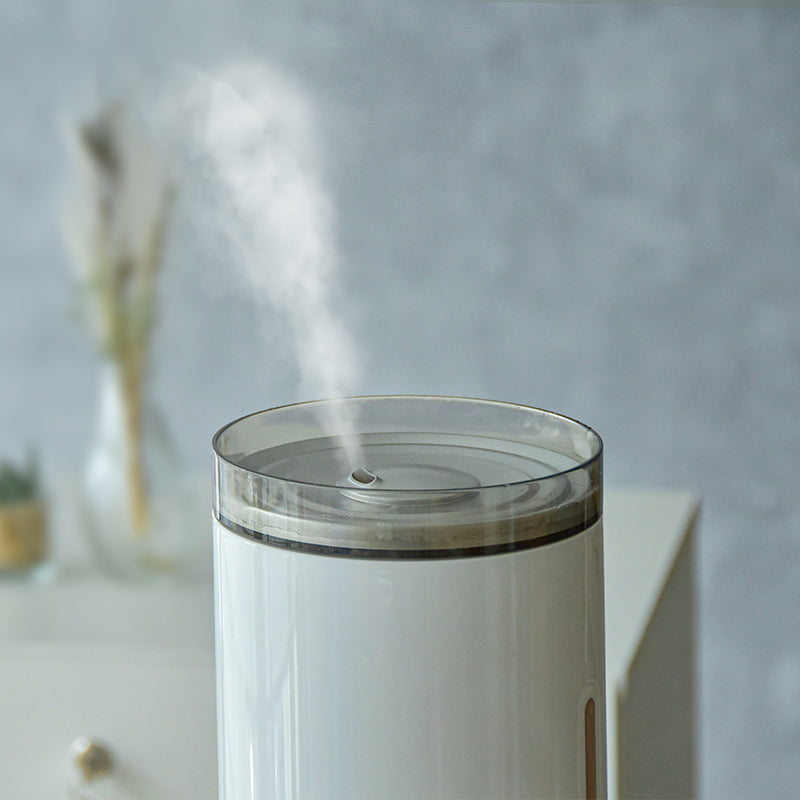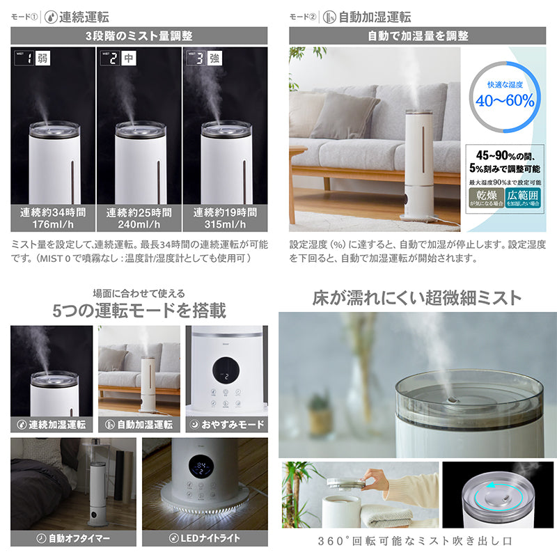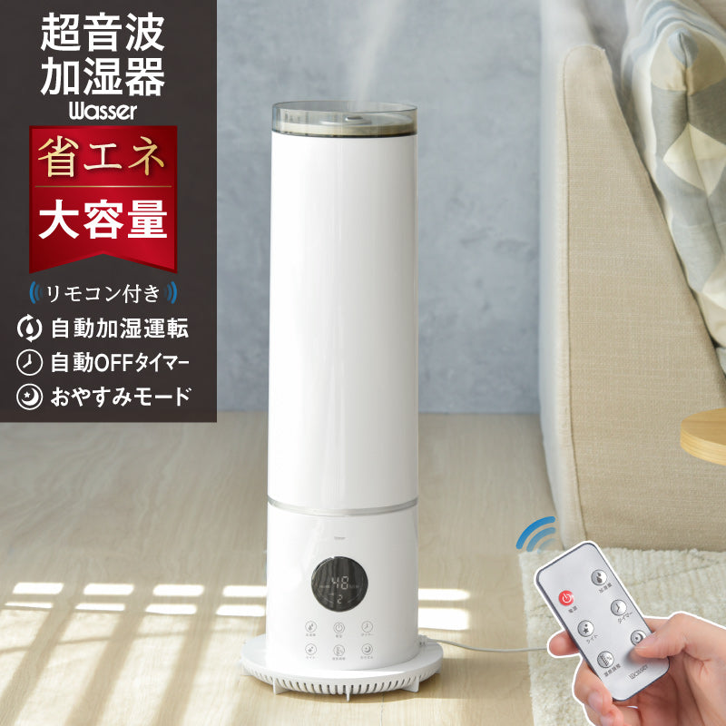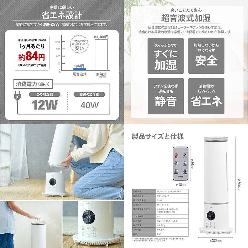●省エネ、大容量の超音波加湿器。フタを外し、上からの給水が可能。 高さを抑えたデザインで、お部屋においても圧迫感を感じません。 実用性とデザイン性を兼ね備えている一台。6Lの大容量で弱運転最長34時間連続運転。 内蔵センサーでお好みの湿度をキープし、自動に加湿するので、さらに長時間の運転も可能。 液晶パネルで一目周囲の状況や加湿器の設定を確認できます。 おやすみモードでパネルが自動消灯。空焚き防止の自動OFF機能搭載。 メイン部分とタンクが分かれていて、お手入れ簡単。 セラミックボールの浄水カートリッジ付き。リモコン付き、遠隔操作が可能。