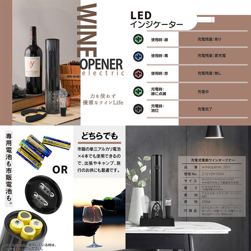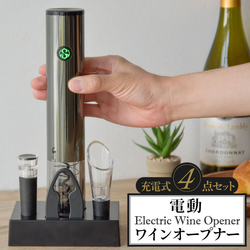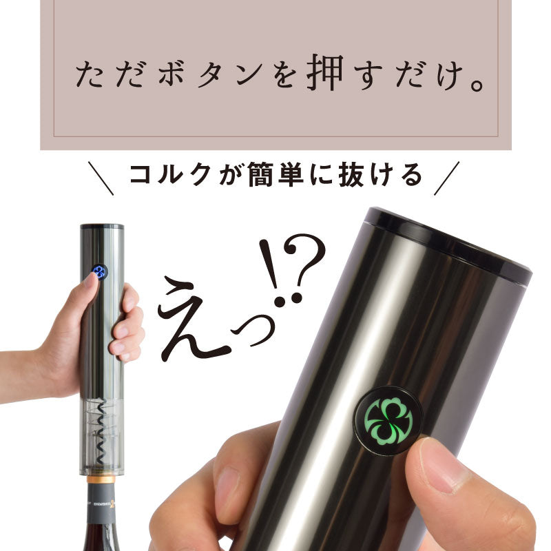 ●『開けて・味わって・保存ができる』ワインを気軽に楽しむ4点セットの登場。 ただボタンを押すだけ!電動式でコルクがスイスイと簡単に抜けます。 片手で静かに開栓。一本~数十本まで!力を入れることなく瞬間開栓。 使えばわかるこの便利さ!好きなワインがもっと好きになる!そんな便利アイテムです。 ハイパワーモーターを内蔵しているのに静音。 ボトルの注ぎ口にスクリューを垂直に当ててボタンを押すだけで、スルッとコルクが抜けます。 絶妙な圧力でアプローチするので、コルクのカス等が出にくいです。