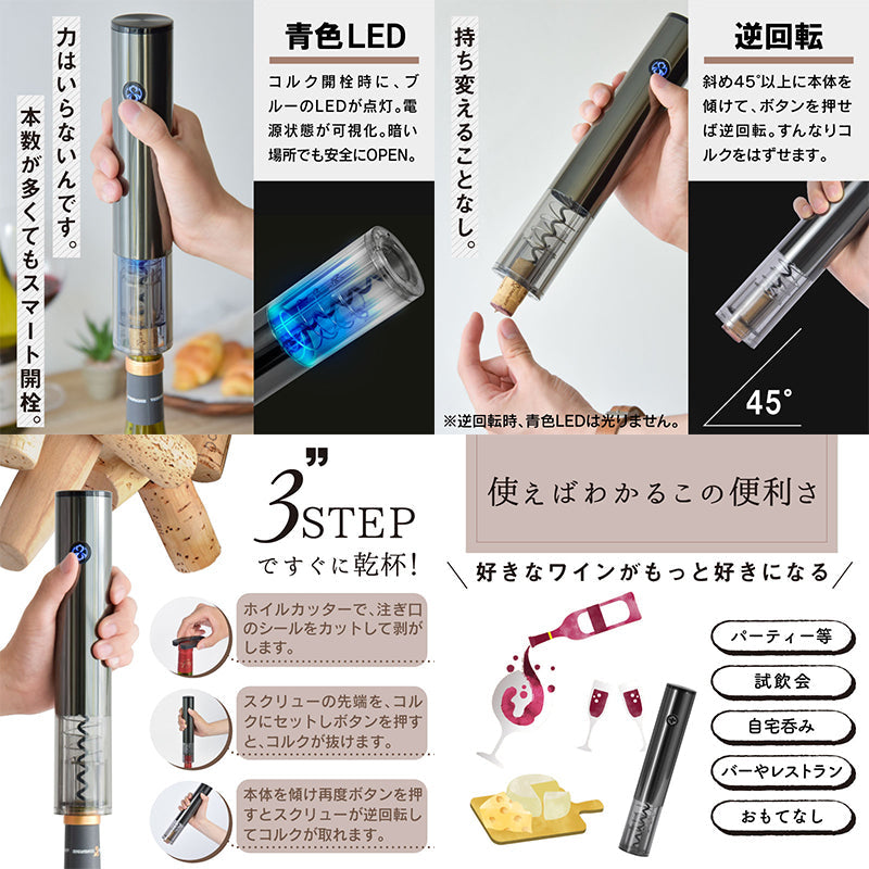 電動式でコルクがスイスイと簡単に抜けます。片手で静かに開栓。こんな場面で大活躍!●パーティー等●試飲会●普段の自宅呑み●バーやレストラン●おもてなしetc.... |