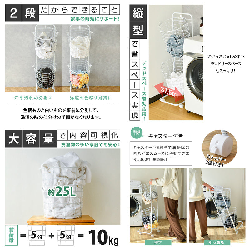●限られたスペースでも洗濯物を分別できる大容量のタテ型2段式ランドリーバスケット。 大容量のタテ型2段式ランドリーバスケット。 省スペースでも洗濯物を分別できるデザイン。 25L大容量バスケット×2個。 取り外し可能なハンドル付きバスケット。 スタッキングができる設計で、まとめ持ちもOK。 インテリアに馴染みやすい、やさしいラウンド型フォルム。 通気性抜群。 シリコンパーツでガタつきやガチャ音を軽減。 ロック機能のついたキャスターを採用。 出し入れスムーズ、ストレスフリーのデザイン間口。 スタイリッシュで実用的なランドリー空間に。