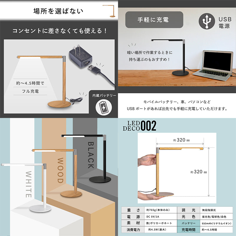 LEDデスク/スティック2wayライト コードレス 3段調色無段階調光 ブラック |