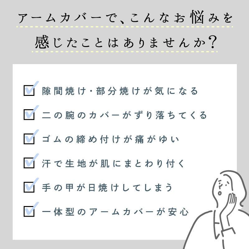 「ゴムや滑り止めの締め付けで、二の腕が痛がゆい」「シャツとアームカバーの間が日焼けしてしまった」etc…従来のアームカバーで感じた、こんなお悩みを解決します。 |
