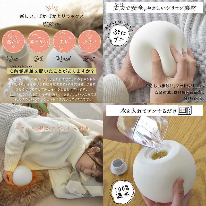 ●マシュマロのような柔らかい肌触りのシリコン湯たんぽ。電子レンジで3~4分加熱してすぐお使いいただけます。 可愛らしい、ぷにぷにの球形に手を添えるだけで、両手にフィットしてポカポカ。 温めたお湯をいれて湯たんぽとしてもお使い頂けます。 また、夏は氷嚢として使用可能。 食品用品質のシリコンなので、丸ごと凍らせて、クーラーボックスにも入れられます。 熱中症・暑さ対策や、怪我の処置などにもご使用頂けます。 ご使用方法をご確認の上、決められた温度と水の量をお守りください。 ※衛生上、中のお水は3日に1度は入れ替えてください。