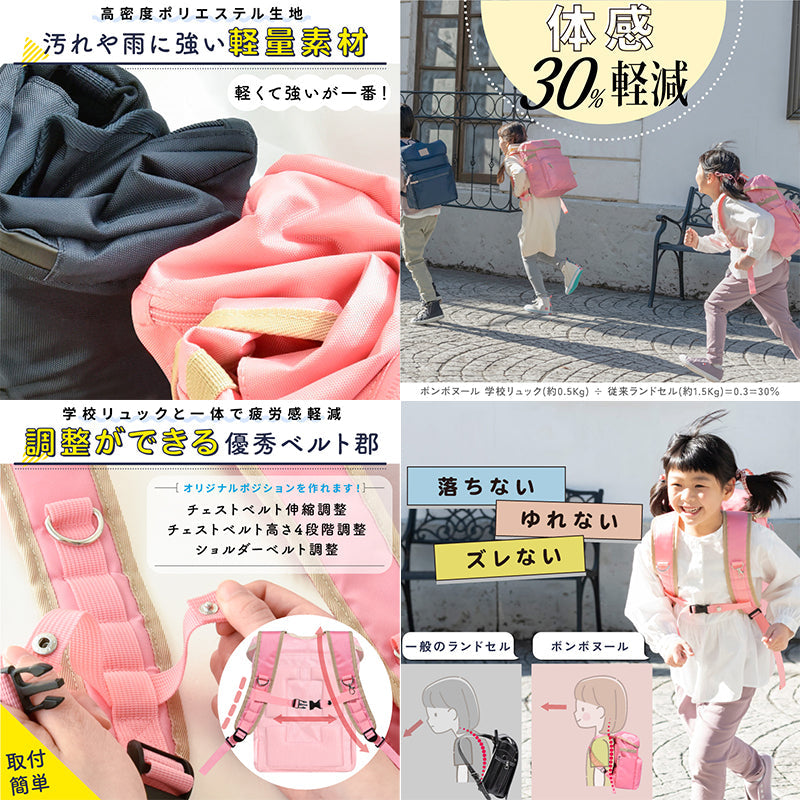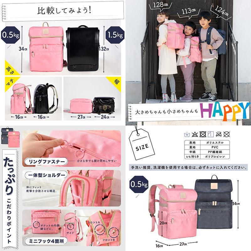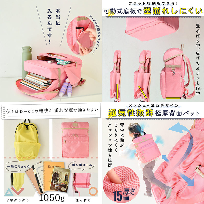 ●細かいところまで配慮をした『子どものための』リュック ・約500gの超軽量ランドセル ・大きな間口で出し入れがスムーズに ・外ポケット付き。さらに中は3箇所の間仕切り、タブレット用のクッションや散乱防止のゴムバンドも付きます ・収納時は折り畳める ・たっぷりクッションで疲労性を軽減 肩周りのショルダーベルトがふかふかで、暑がり、わんぱくな子どもをサポートします ・成長に合わせた上下4段、長さ22~36cmでの伸縮調整が可能 ・手洗い、もしくはネットに入れて洗濯機で弱設定にし、日陰干しをすることで家庭での洗濯を実現