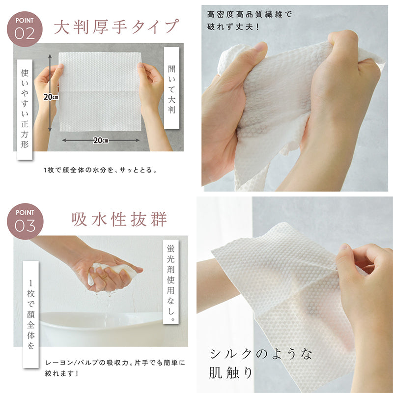 ・常に清潔なものを素肌に使いたい ・タオル類の洗濯が多い時 ・ティッシュより吸収性高く、キッチンペーパーより優しい素材を探している ・通常のタオルの摩擦と細かな繊維が気になる |