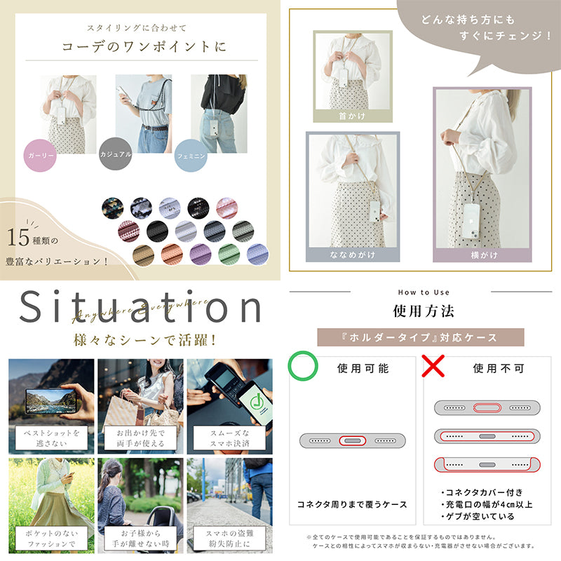 ・スマホの定位置を作りたい ・高級感×カジュアル兼ね備えたデザイン ・スグに写真撮りたい ・家族みんなで使える ・ショルダー調整ができる ・身軽に外出がしたい…etcにおすすめ! |