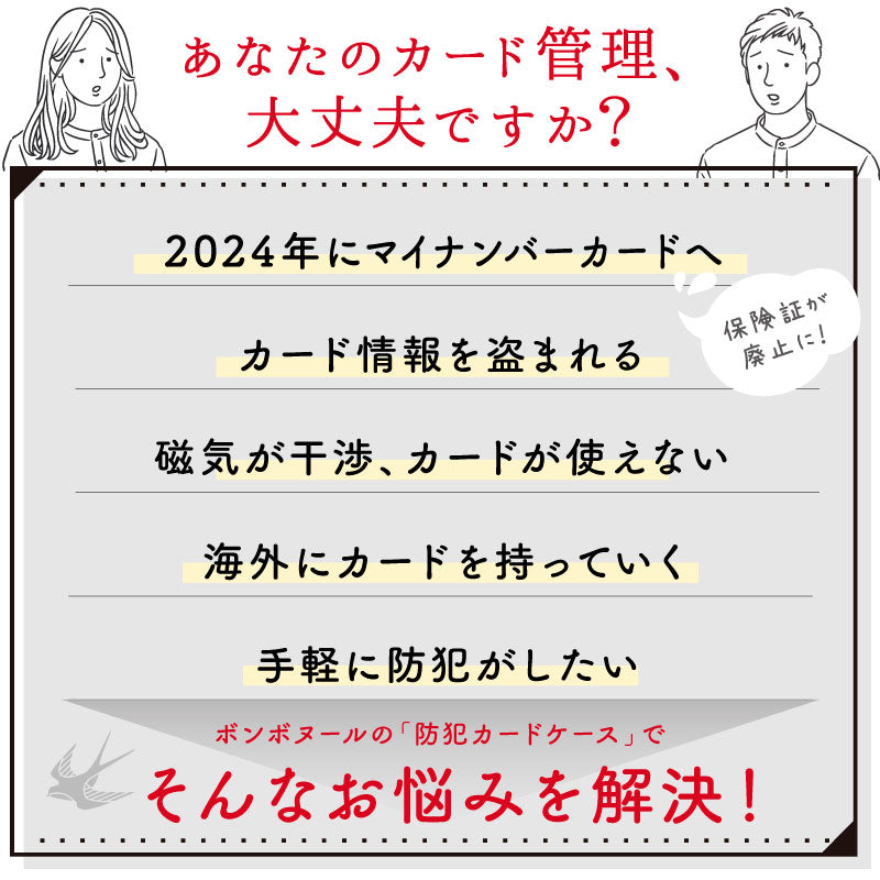 ・お出かけの時に小物の定位置を作りたい ・スキミング防止の防犯カードケースが欲しい ・身軽に外出がしたい ・高見えするケースが良い ・海外旅行で使えるカードケースを探している |