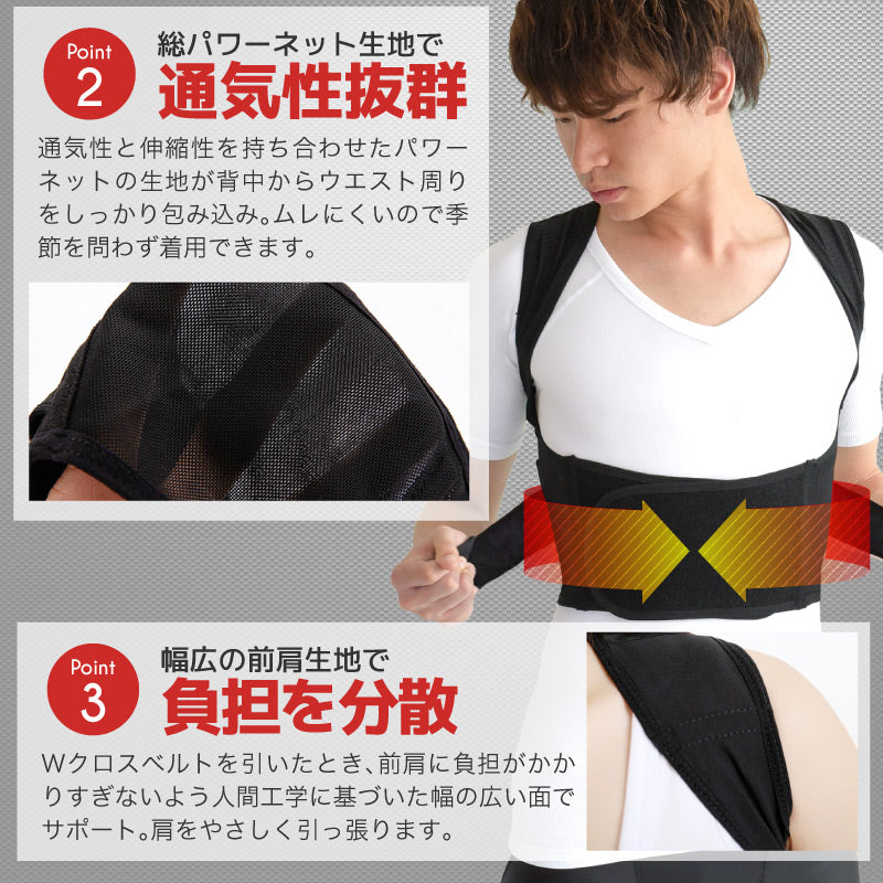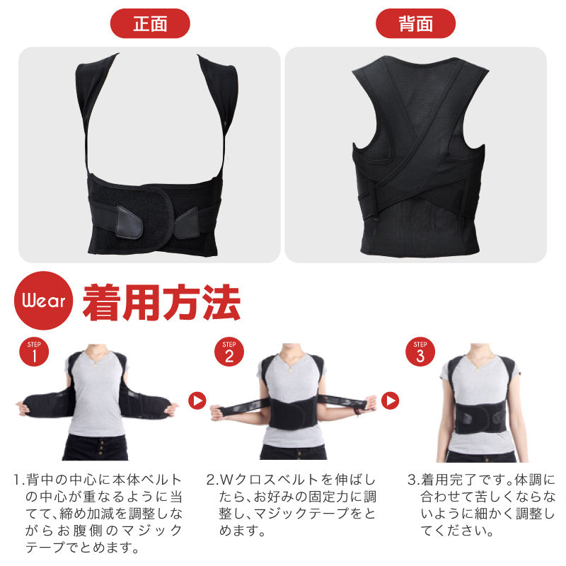 ●・マジックテープ式で着脱簡単 ・伸縮性・通気性抜群の生地が360度しっかりサポート ・6本のパワーズボーンで着用したまま強さを調整 ・お腹周りもサポート ・猫背になりがちなデスクワークや普段使いにオススメ