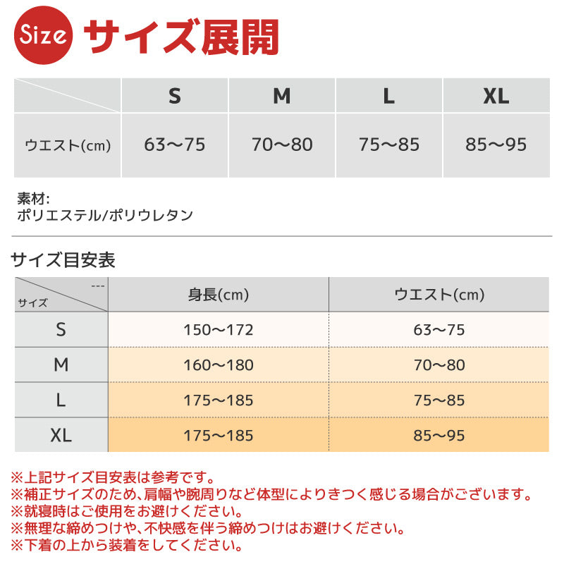 ※補正用サイズとなっており少し小さいと感じる場合がございます。 ※身長・ウエスト周りに合わせてお買い求めください。 ※多少色落ちする場合がございます。 ※お洗濯の際は、白や淡い色の物とは分けてください。 ※白や淡い色の下着や洋服と一緒に着用される場合は、ご注意願います。 |