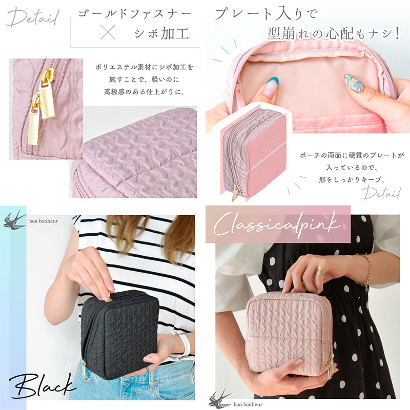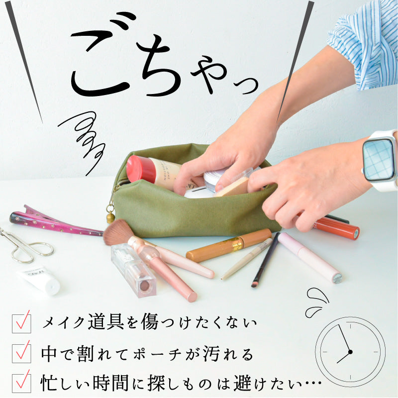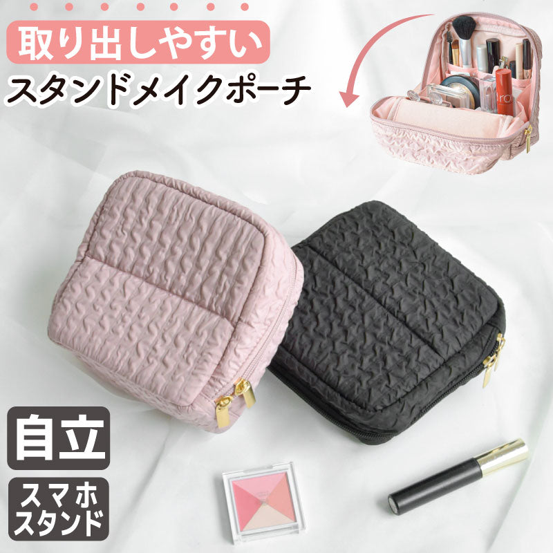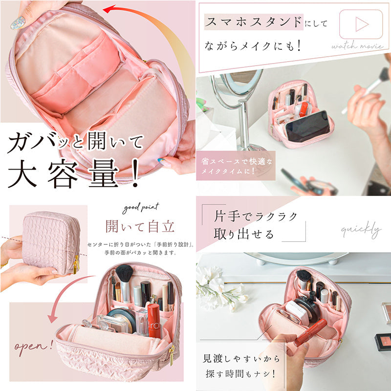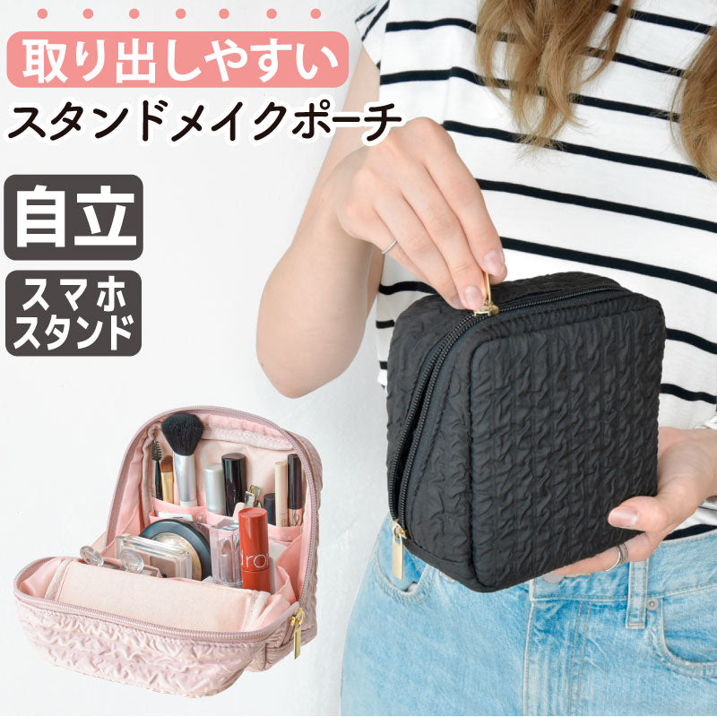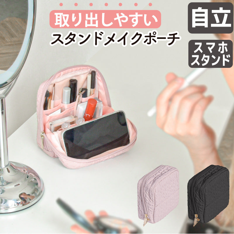 ●取り出しやすさに特化した化粧ポーチ。◆取り出しやすさ抜群の「手前折り設計」本製品は「取り出しやすさ」に特化した設計。折れ目に沿って手前の面を開くと、見渡しやすい自立型ポーチ片手でメイク道具が取り出せる優れもの◆折った面はスマホスタンドに縦置きでも、横置きでもスマホスタンドと収納が一緒になってコンパクトいつでもどこでも快適なメイクスペースに◆デイリーポーチにもモバイルバッテリー、メガネ、メモ、ボールペン、ハンカチなど普段持ち歩く物を入れてもgood立てて収納できるから、たくさん入れてもゴチャっとしません
