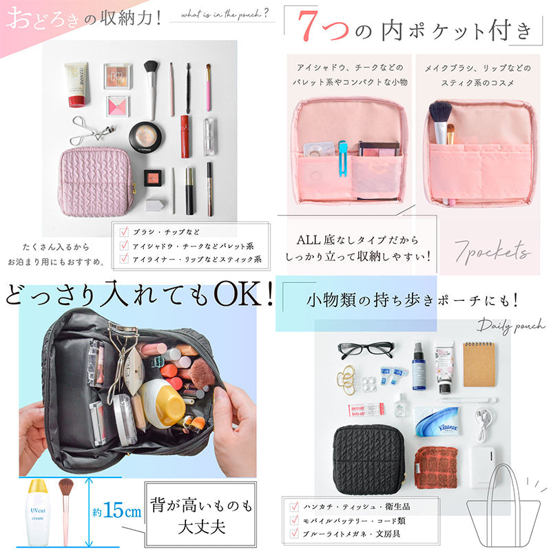 取り出しやすいメイクポーチを探している方・メイクをしながらスマホで動画視聴をしたい方・お泊まりセットを収納できるポーチを探している方に・高見えするメイクポーチが良い |