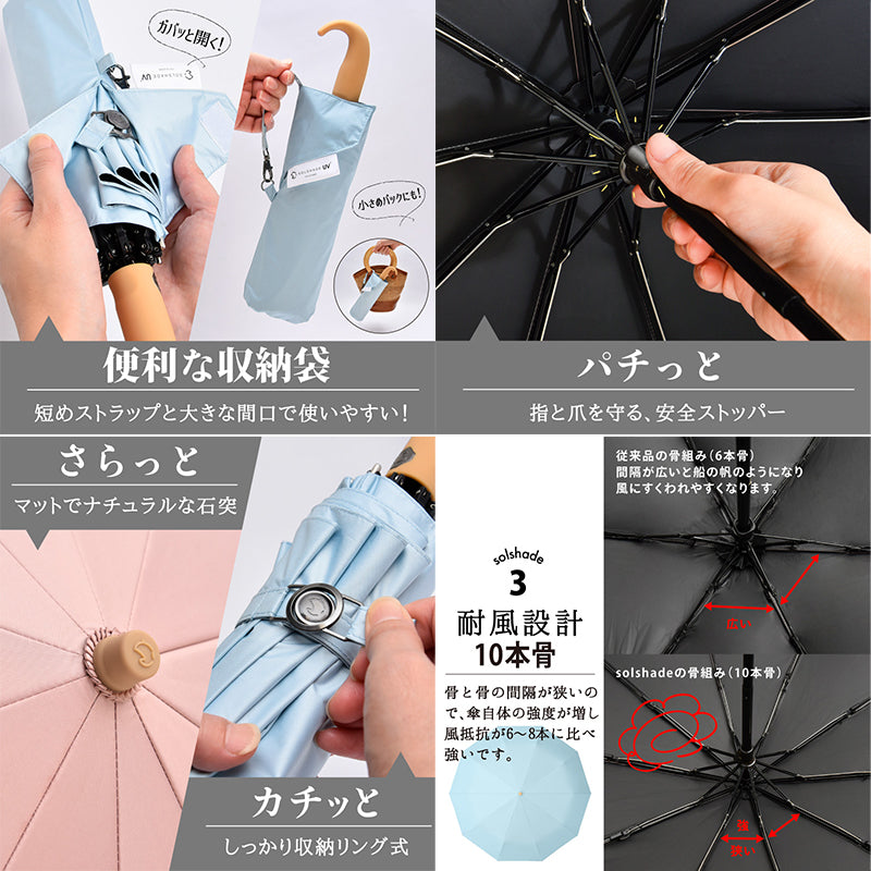 ●過度なデザインや協調性を抑え、使う人の気持ちに寄り添ったデザインと機能性を備えた『ソルシェード oneシリーズ』・国内ブランドメーカー・遮光率100%・UPF50・紫外線遮蔽率99.9% (第三者機関での測定試験済み)・晴雨兼用・軽量設計・高撥水・耐風機能・骨組み10本使用の耐久性に優れた日傘・独自に開発した特殊構造の持ち手グリップ・安全ストッパー採用爪を挟まず、ネイルが痛まない・出し入れ簡単な収納袋付き・コンパクトな4段折畳み式・年齢を問わず愛用できる上品なペールカラー・シンプルなのにパーフェクト設計