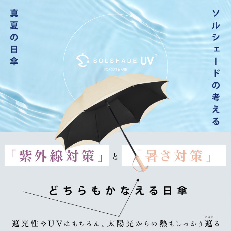 ●現代×昔ながらの製法で作り出した清涼空間。やさしく肌になじむ天然木本来の風合いと、かわず張りの美しい二重シルエットを生かしたオリジナル傘。一般的な日傘とは違い、2つの生地を張り合わせた隙間から熱を逃します。遮熱効果が薄れやすい一般の日傘と比べ、2層構造のため直射日光から受けるダメージを軽減します。・国内ブランド メーカー製品・遮光率100%・UPF50+・紫外線遮蔽率100% (第三者機関での測定試験済み)・晴雨兼用(メインは日傘使用になります)・約320+5g〜・耐風・天然木の持ち手グリップ