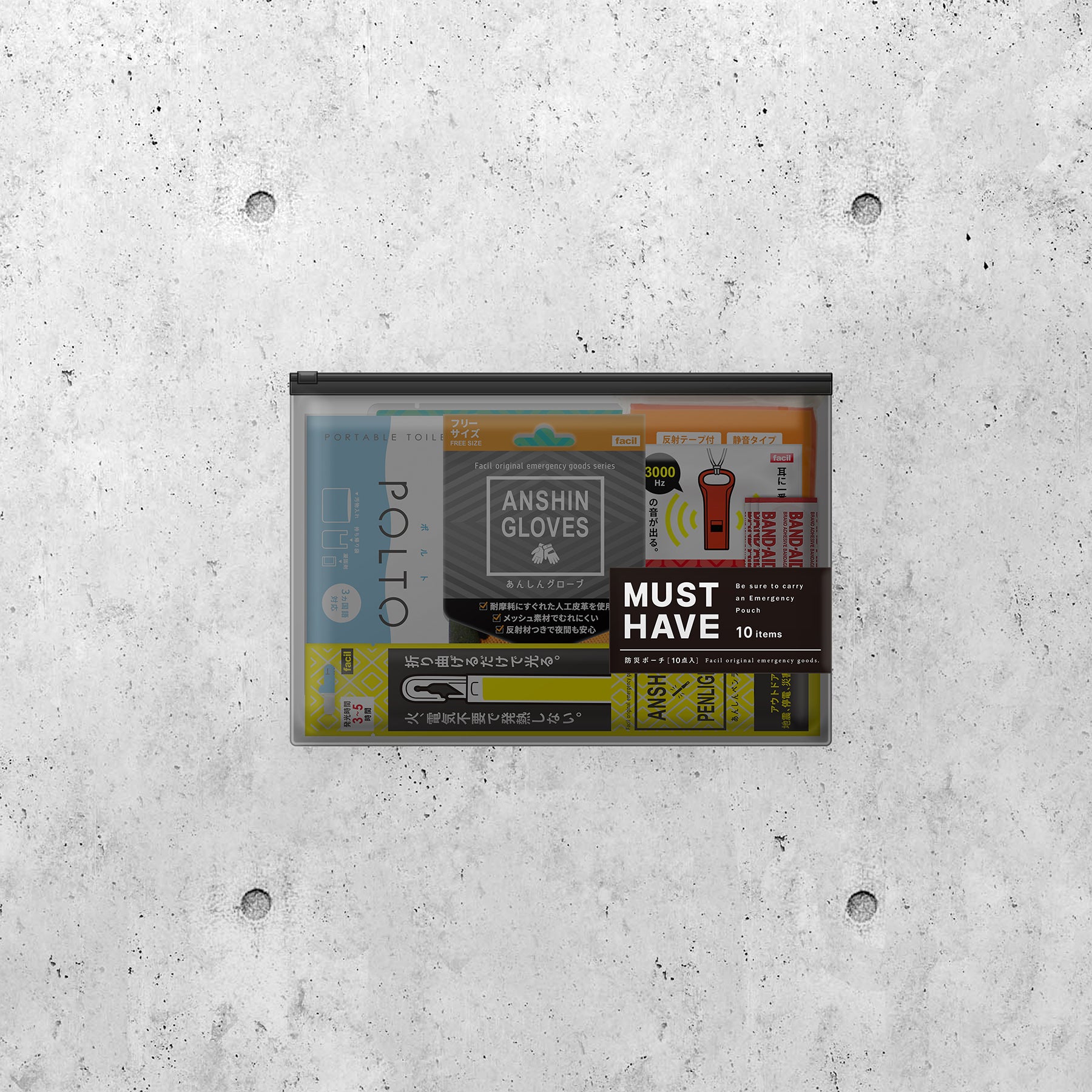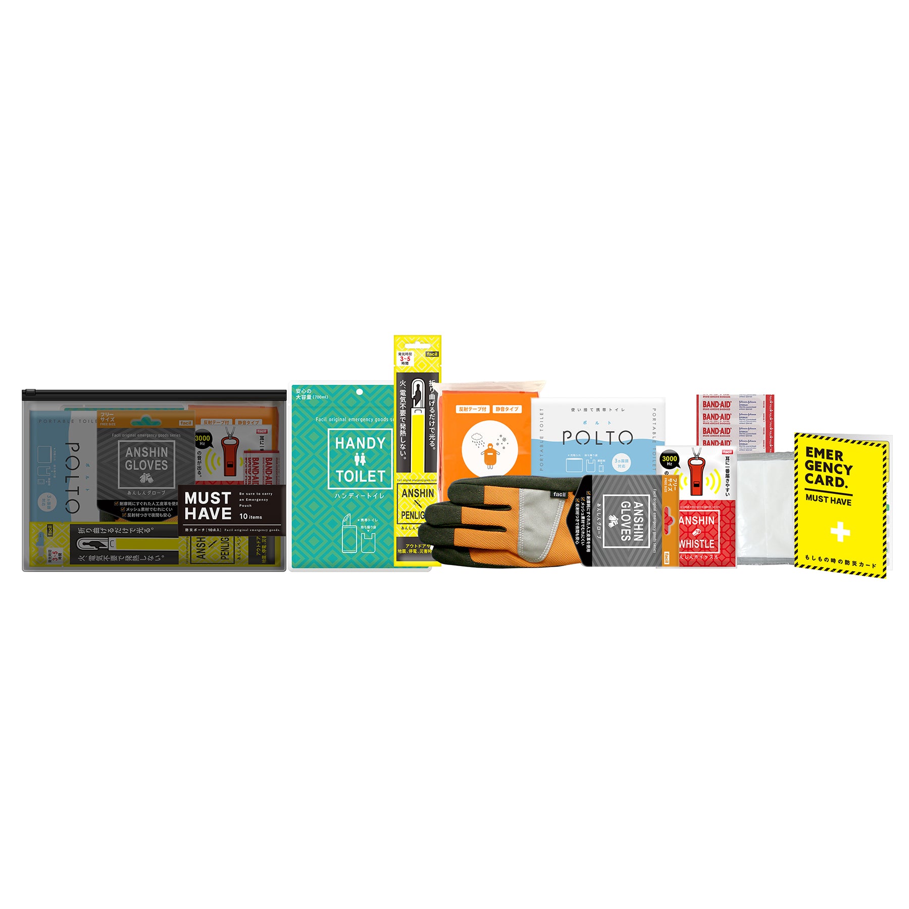 ①クリアポーチ(200×290mm)×1②緊急用ホイッスル×1③静音アルミポンチョ×1④大小兼用使い捨て携帯トイレ×1⑤小専用使い捨て携帯トイレ×1⑥水に流せるポケットティッシュ×1⑦絆創膏(防水タイプ)×3⑧反射付きグローブ×1⑨ノンアルコールウェットティッシュ×1⑩使い捨て簡易ライト×1⑪もしもの時の防災カード×1 |