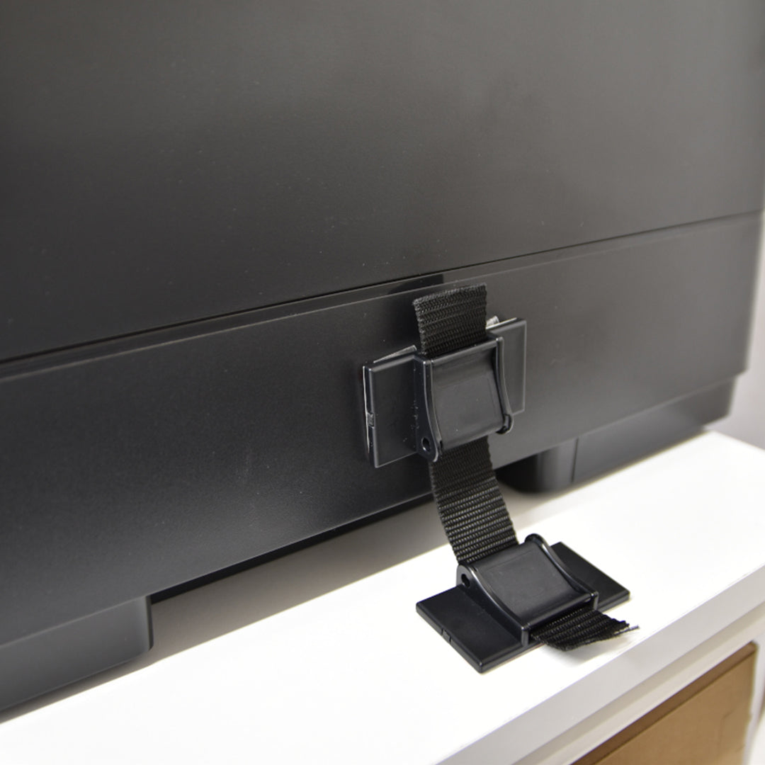 ●強力粘着でOA機器などをしっかり固定し、転倒・落下を防止。バックル式でベルトを外せば移動・清掃が簡単。