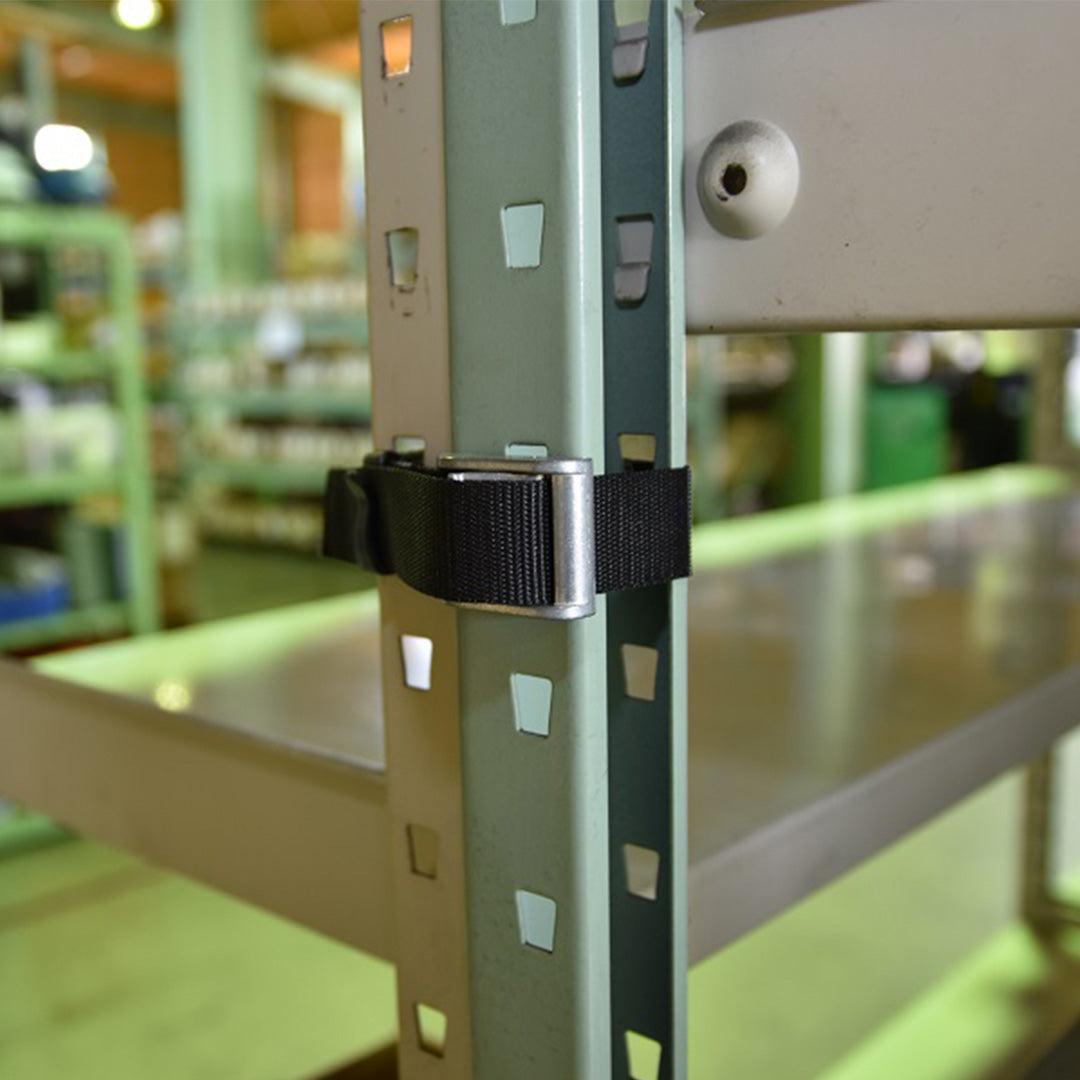 ●並んでいるラックの柱同士をベルトで連結し転倒を防止。ベルト巻き付け部分内側に滑り止め加工でズレ落ちも防止。