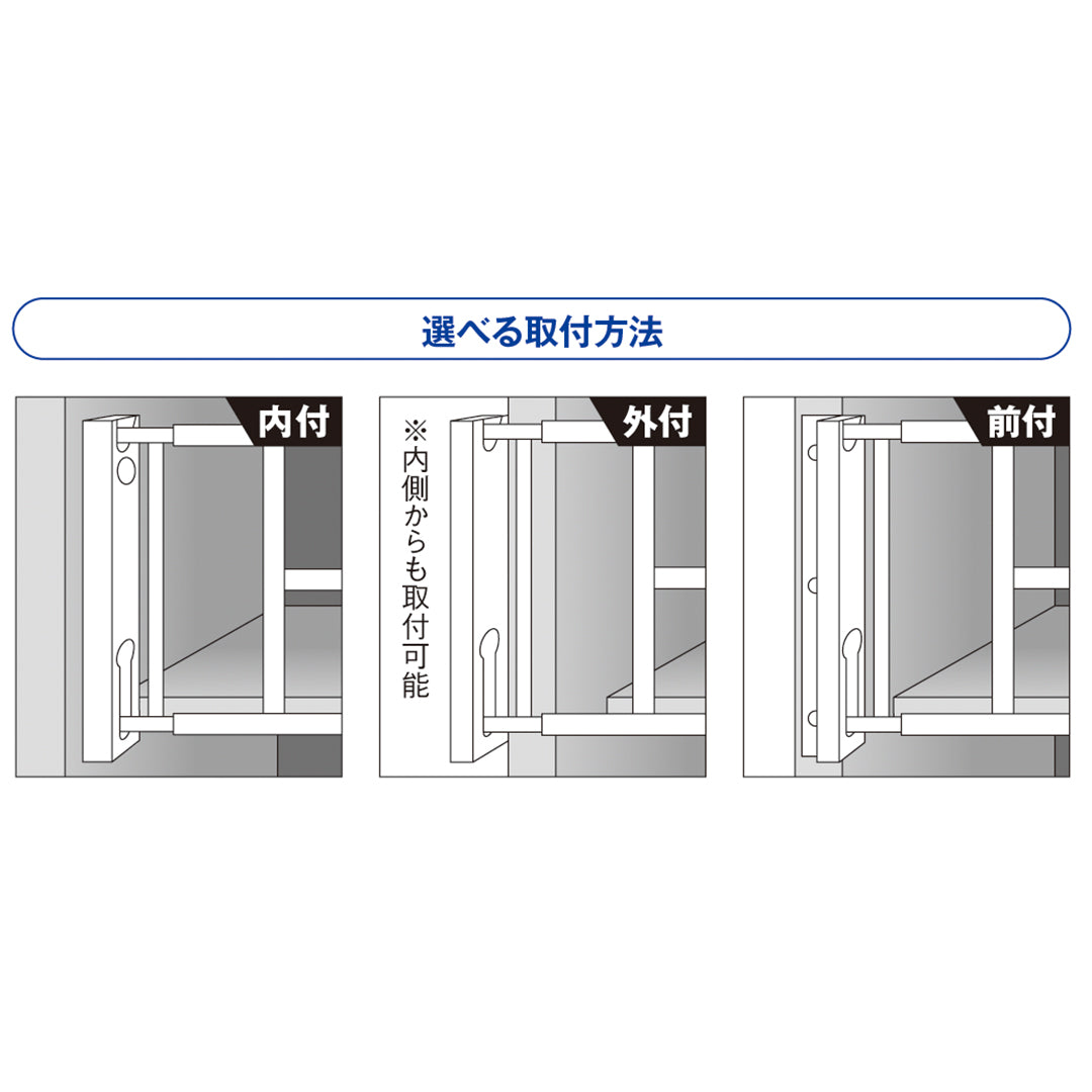 ●オープン書庫等の書類の落下防止対策。スチール製のバーで重い書類が入った書庫にも取り付け可能。バーを持ち上げて手前に倒すだけなので書類の出し入れが簡単。必要のない時はバーの取り外しも可能。