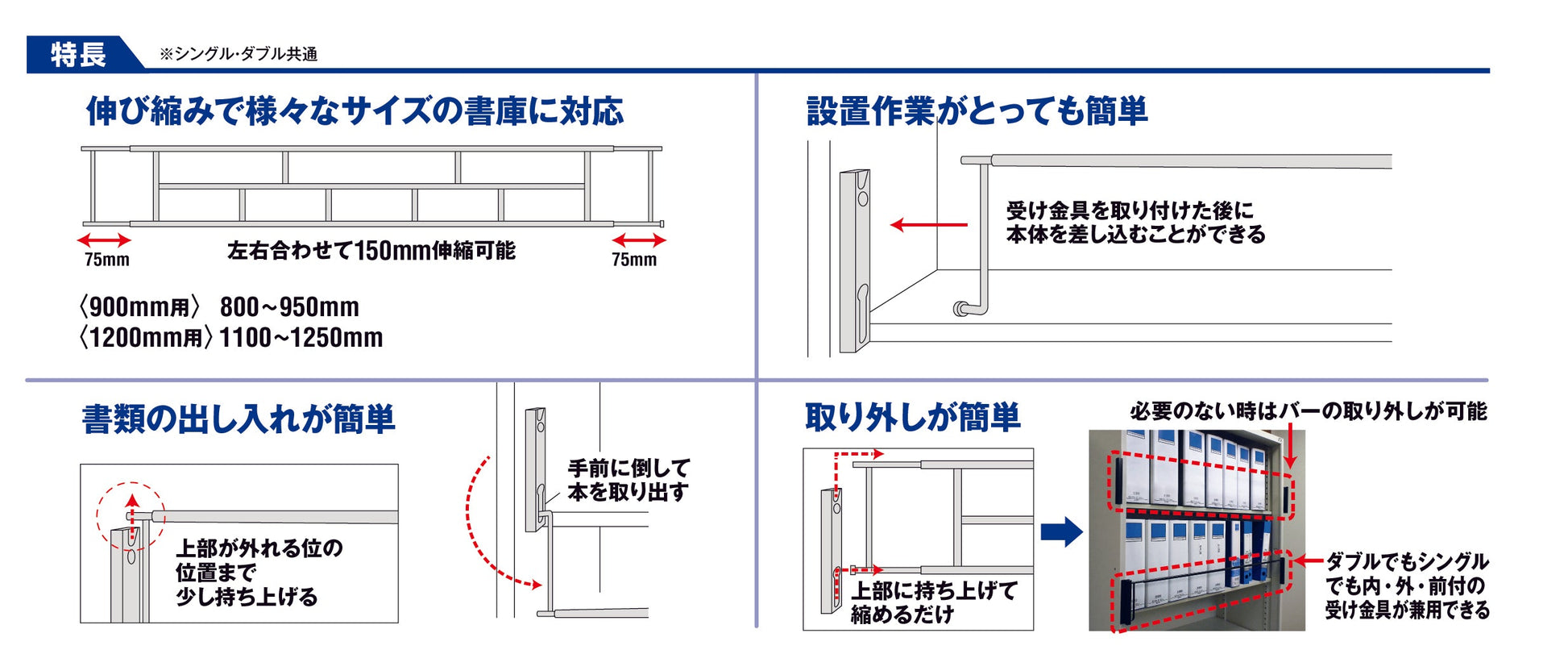 ●オープン書庫等の書類の落下防止対策。スチール製のバーで重い書類が入った書庫にも取り付け可能。バーを持ち上げて手前に倒すだけなので書類の出し入れが簡単。必要のない時はバーの取り外しも可能。