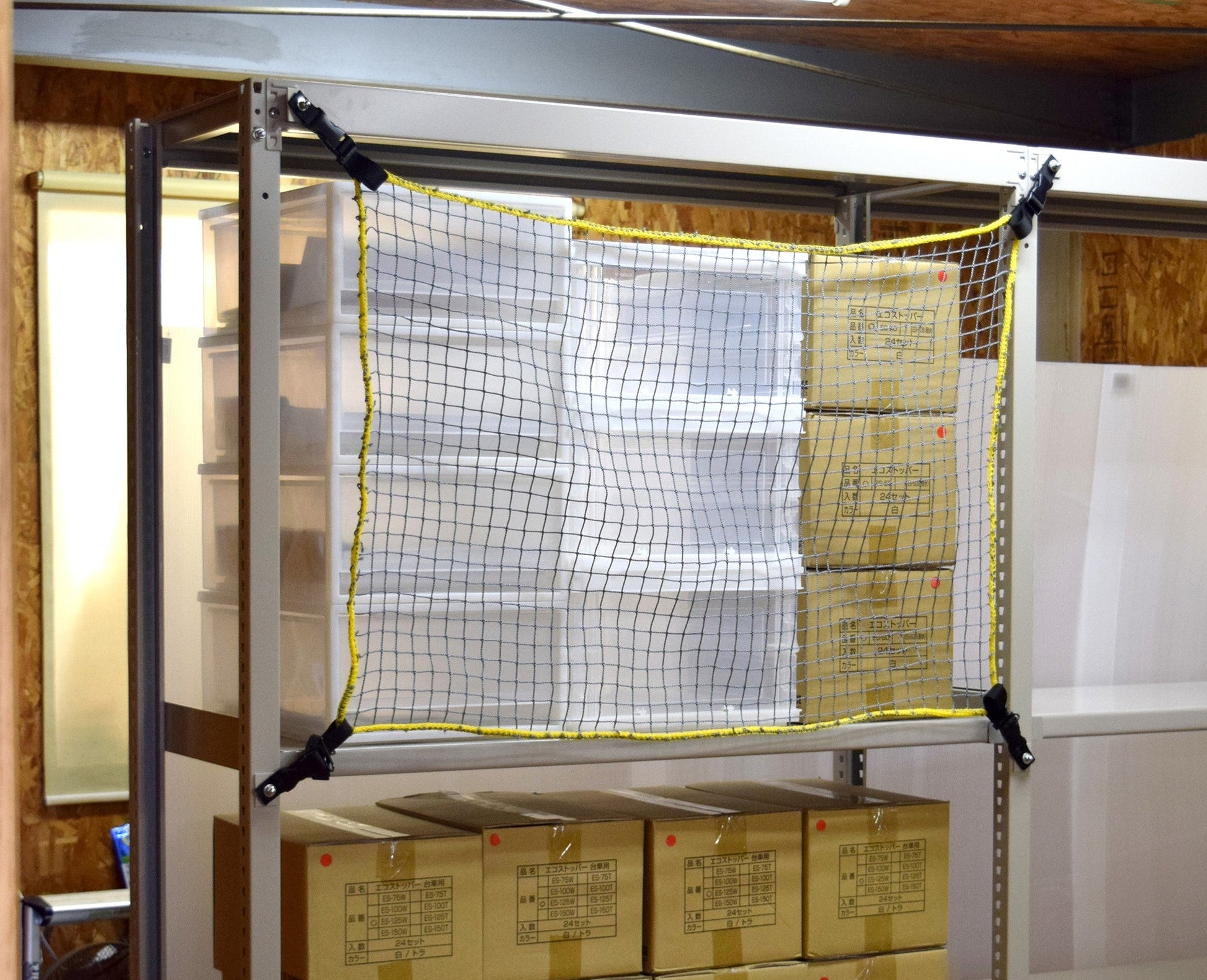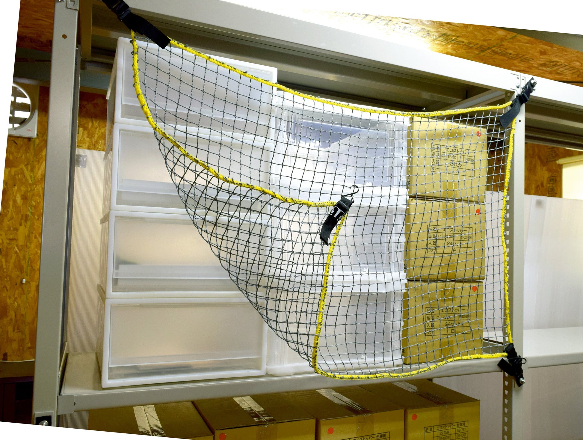 ●ラック内の収容物の落下防止対策。ワンタッチ樹脂バックル付で上下左右4か所どこからでも取り外し可能。下部左右にフックがあり、収容品を取り出す時に引っ掛けることで邪魔にならず出し入れが可能。取り付け方法は粘着付金具固定またはボルト固定の2通り。