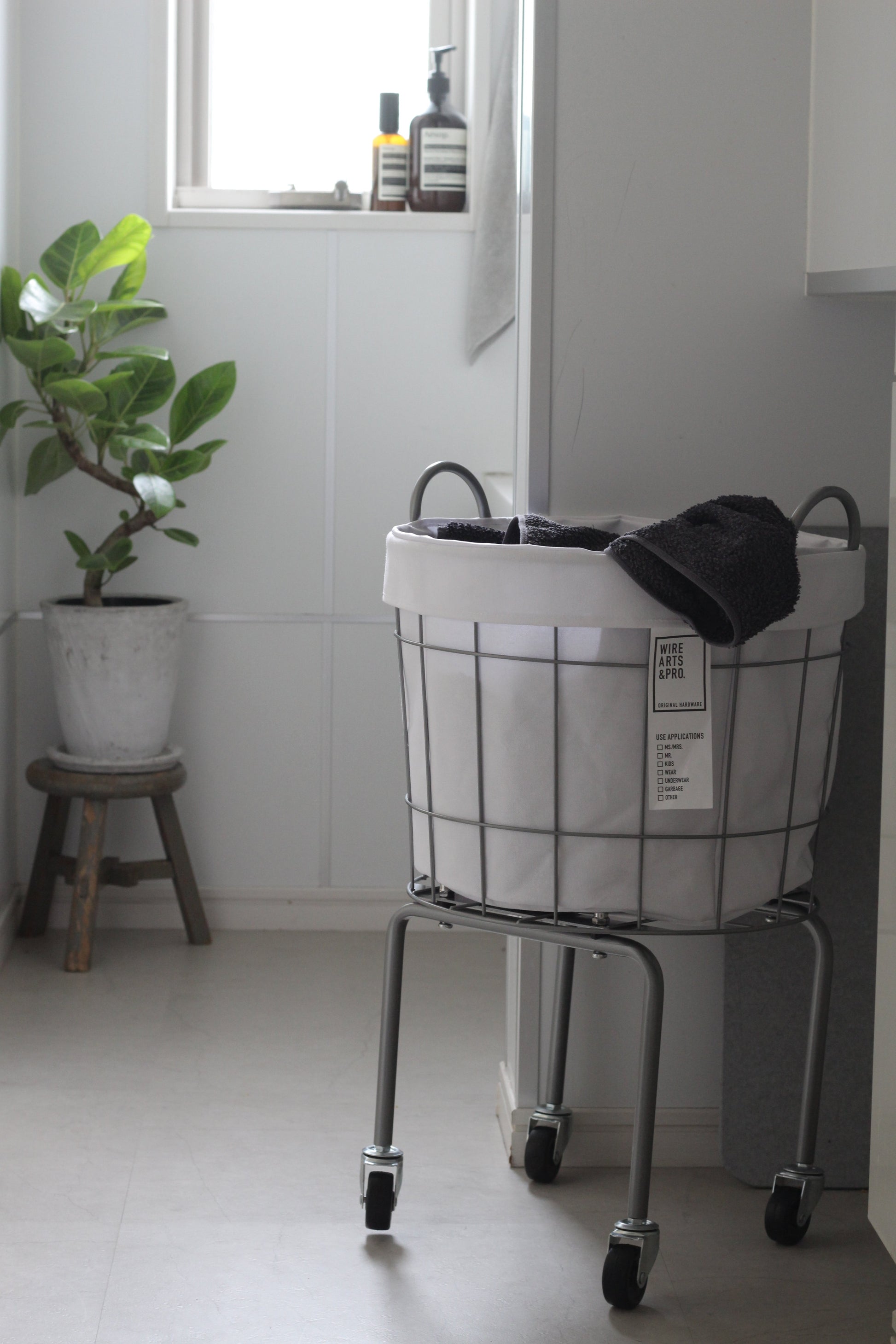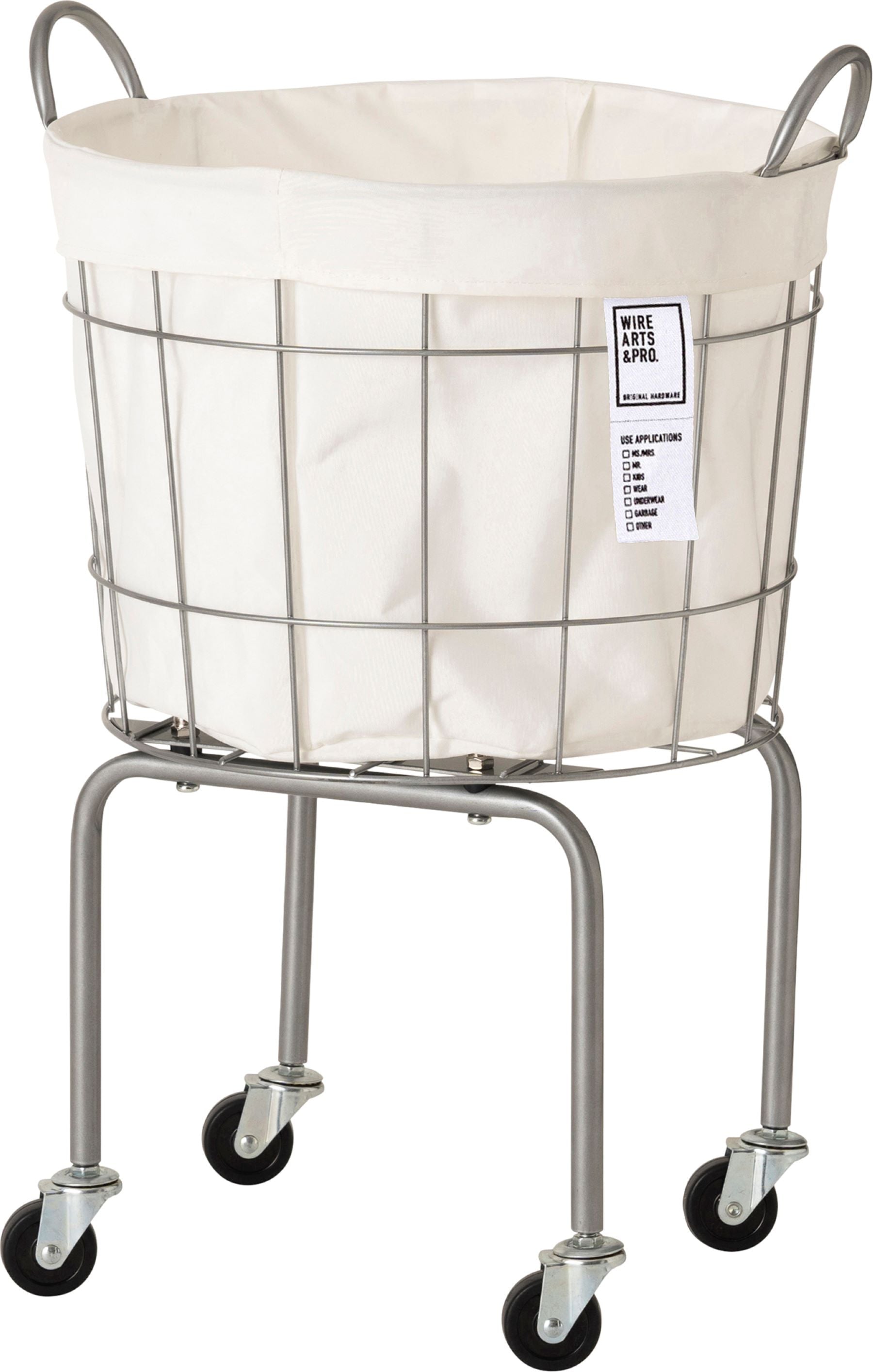 ●コインランドリーで見かける工業用業務用デザインのランドリーバスケットを一般家庭用にリサイズ。 高さを出したキャスターレッグは体の負担を軽減する使いやすいサイズに設計。インナーバッグが付属 している為、ハンカチ等の小さめの洗濯物でも床に落ちる心配がなくストレスが少なく使用が出来ます。
