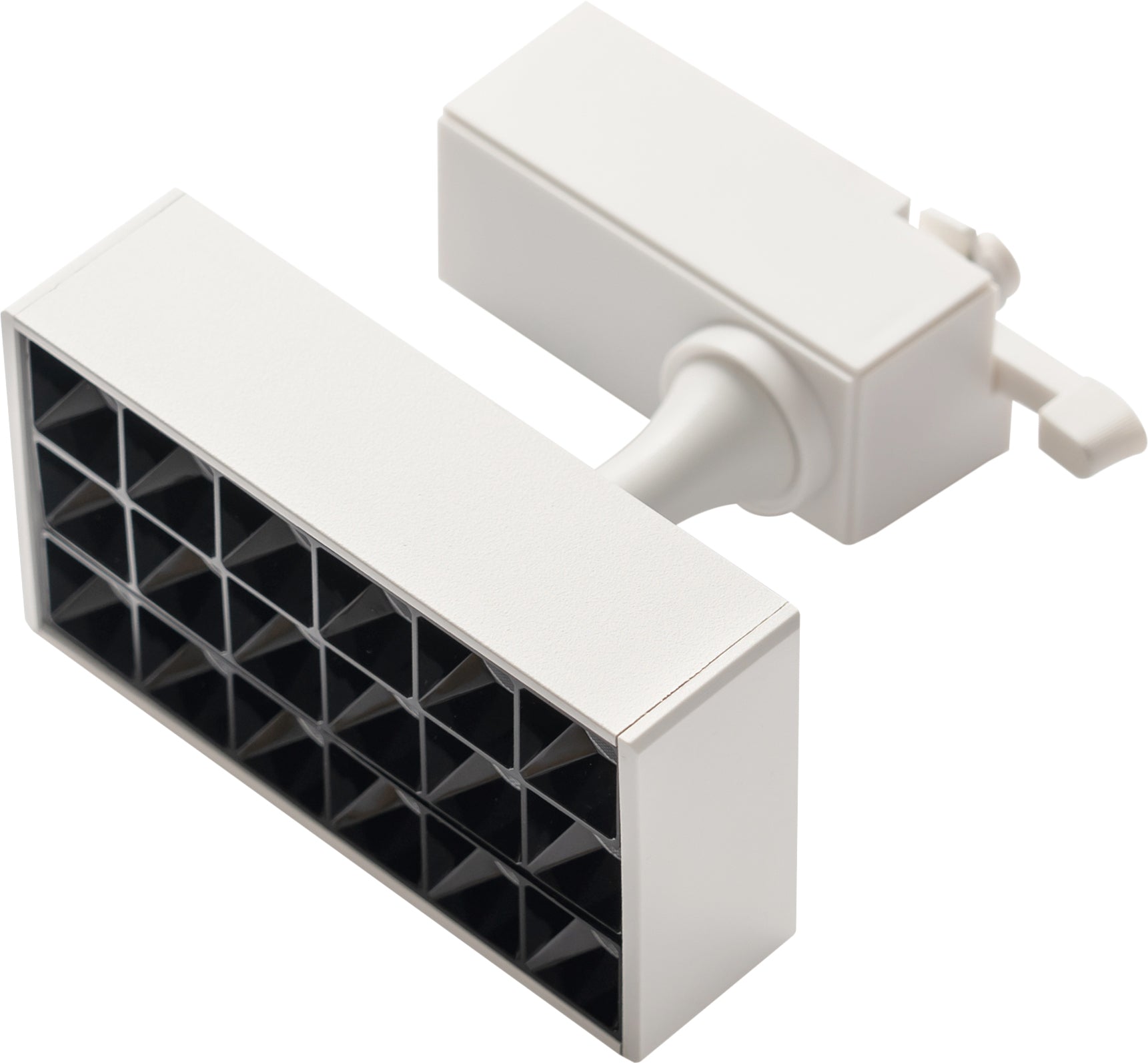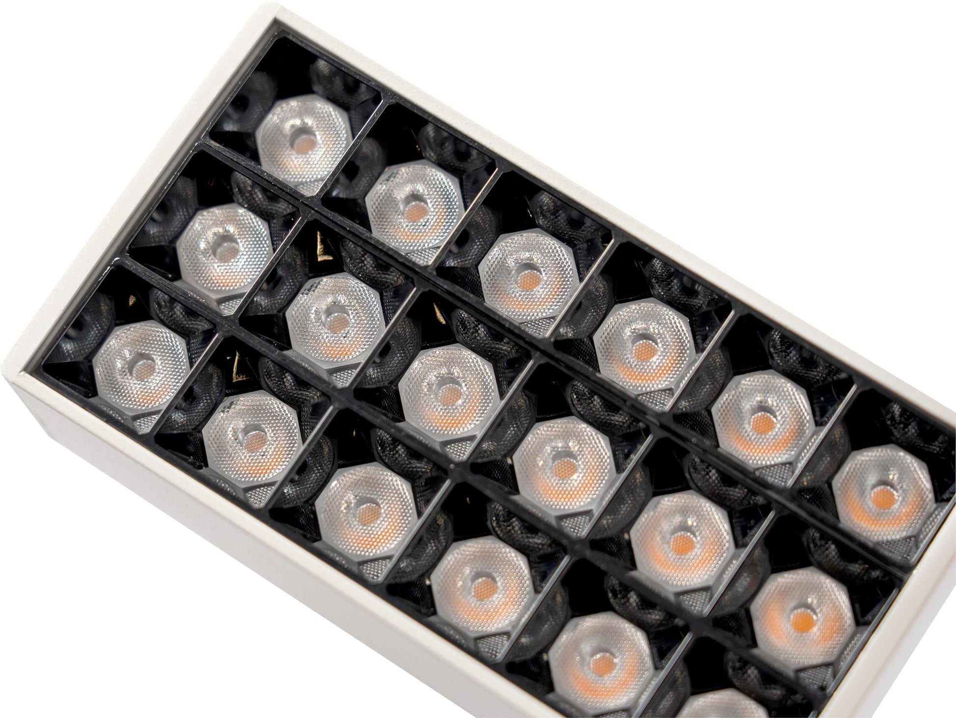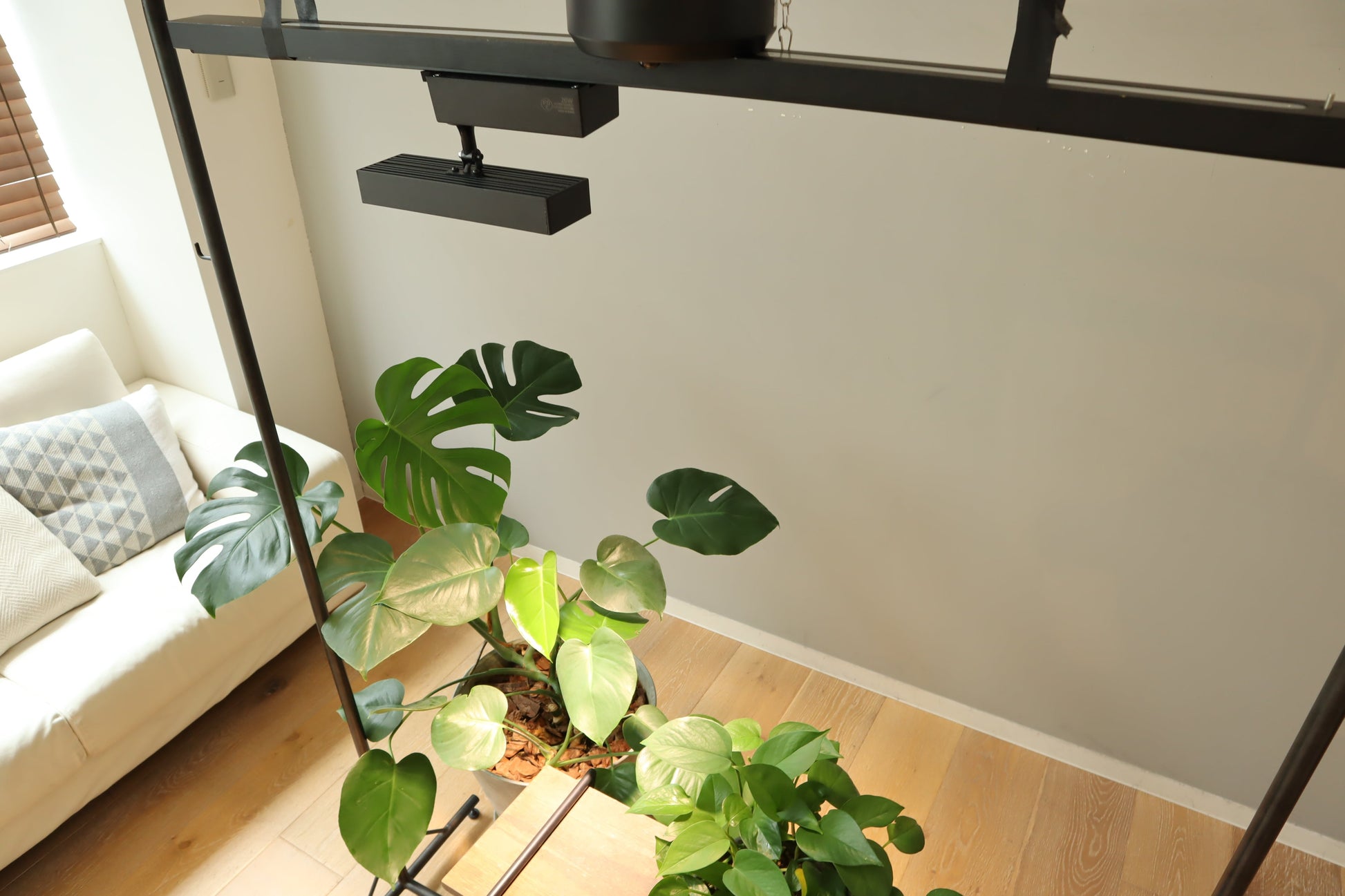 ●日当たりの悪い場所でも、ダクトレールに取り付けて植物が光合成に必要な光を届けられるスポットライト。太陽光に近い自然な光が植物の生長や健康維持を促します。照射部分のレンズは光を拡散させることで、植物育成用の電球よりも広範囲を照らせるため、壁面緑化にも適しています。照明は角度調整が可能なので、日々の環境や育成状況によって変わる植物の様子に合わせて、光が必要な場所を必要な分だけ照らせます。
